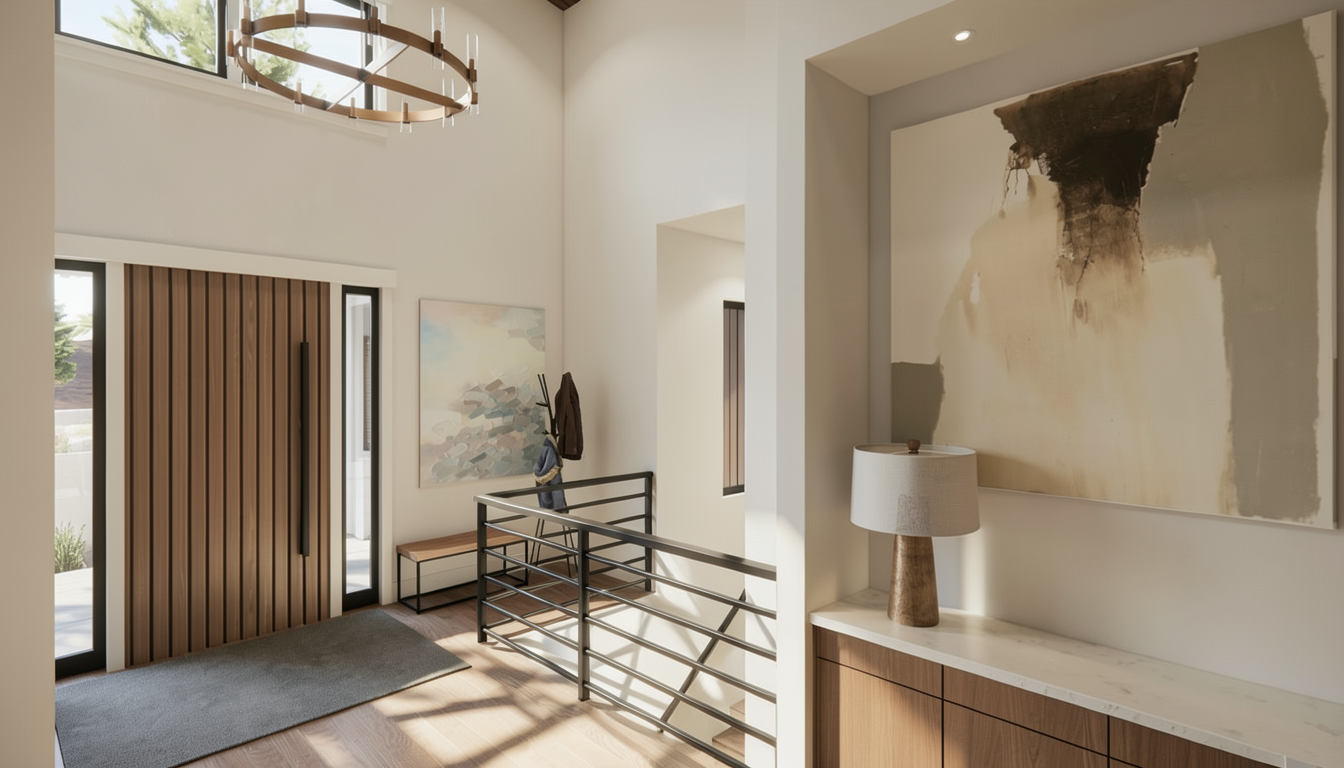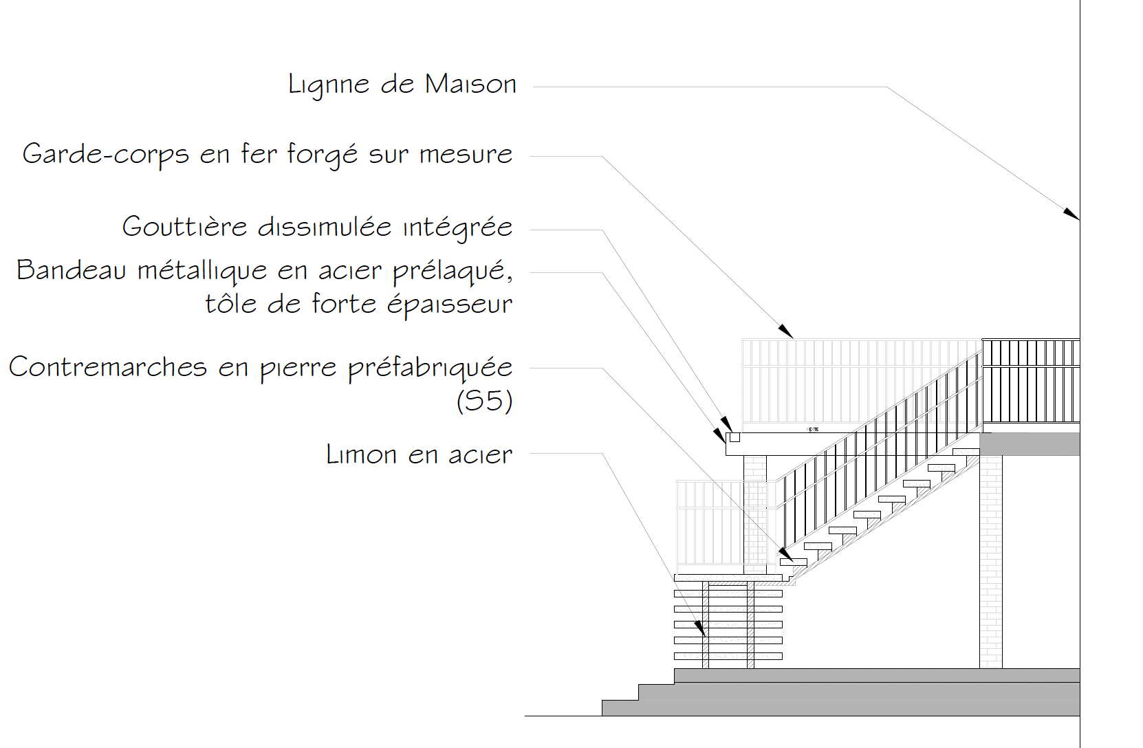 make this sketch into a 2d sketch keep all proportions keep all angles do not add anything not in drawing follow all lines in sketch black metal railing floating concrete steps with black metal stringer dingle story and exterior no back ground columns are in red brick