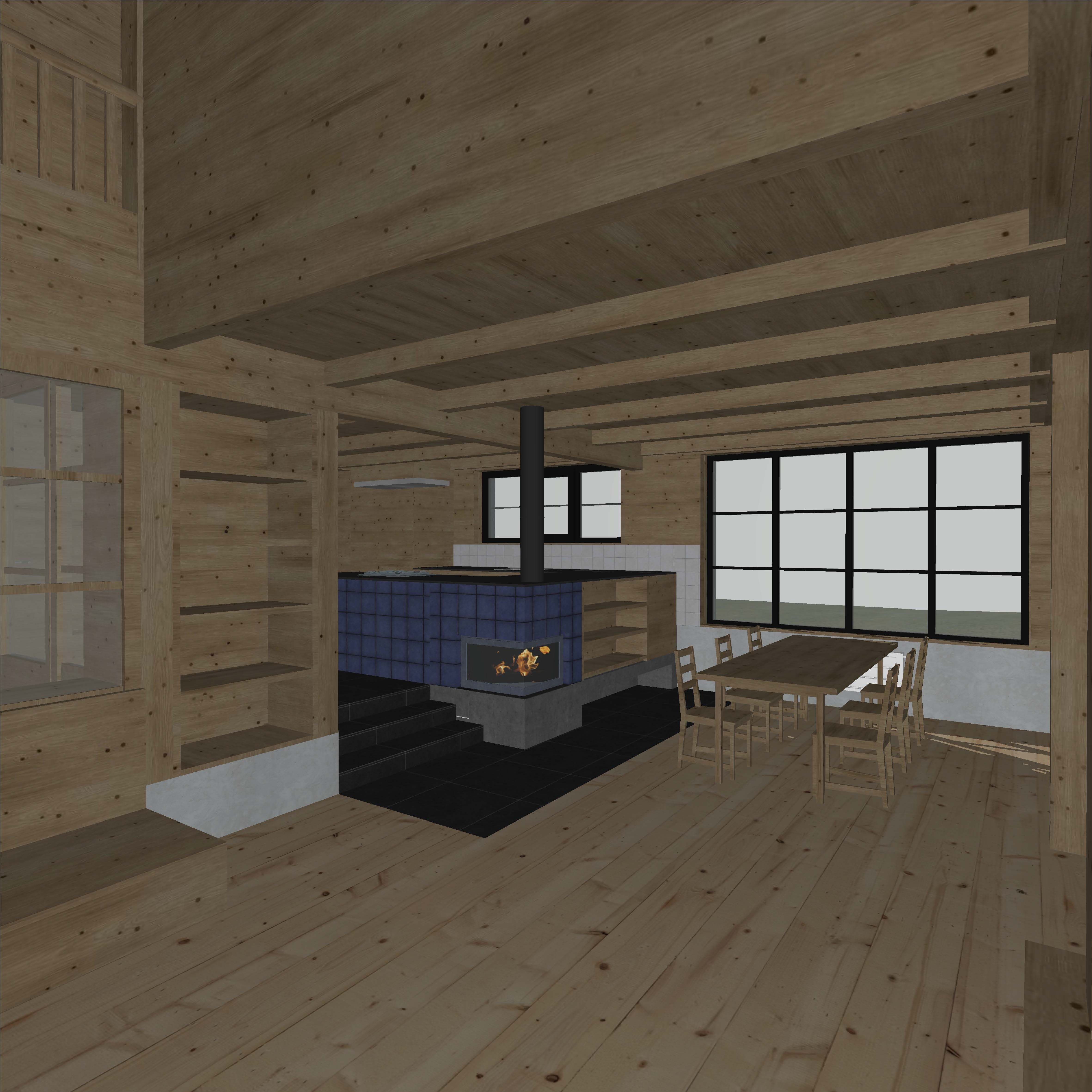 a highly photorealistic scandinavian style wooden interior with exposed timber structure walls ceiling and floors are made of light natural wood with visible grain knots and subtle imperfections the space features an open plan layout with a double height ceiling and exposed wooden beams in the center a modern tiled fireplace stove with blue ceramic tiles and a black metal chimney pipe extending to the ceiling the fireplace sits on a slightly elevated dark tiled platform with clean edges and realistic material contrast to the side a simple wooden dining table with matching chairs placed near large black framed windows soft natural daylight enters through the windows creating gentle shadows and realistic light bounce across the wooden surfaces on the left side built in wooden shelving filled with a mix of books and magazines naturally arranged with slight randomness a wooden bench in the lower left corner features soft seat cushions in neutral tones beige grey with natural fabric texture and slight creases for realism lighting soft natural daylight combined with warm firelight from the stove realistic global illumination subtle shadows slightly cinematic atmosphere style ultra realistic pbr materials high detail natural imperfections ray tracing realistic reflections scandinavian minimalism