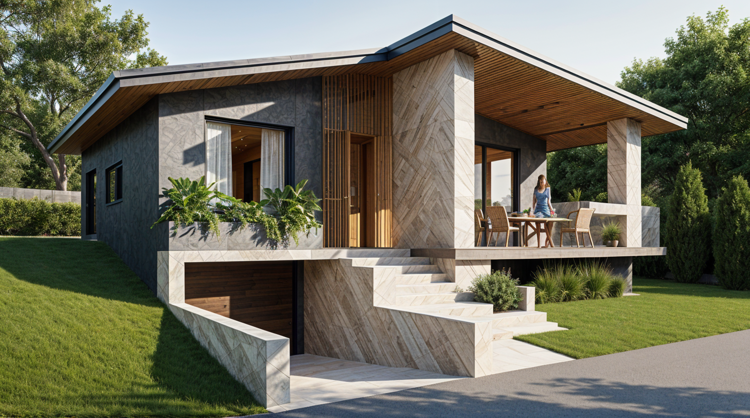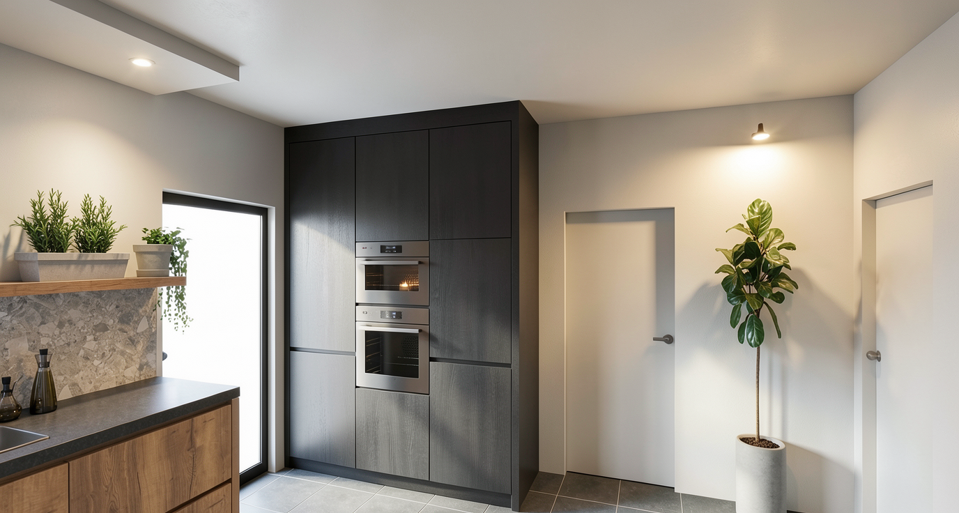 make from this plan a render in a corner in 3d render in the same colours as the plan add some minimalistic lightning above the kitchen counter add a plant on the left counter add a painting make the plant green