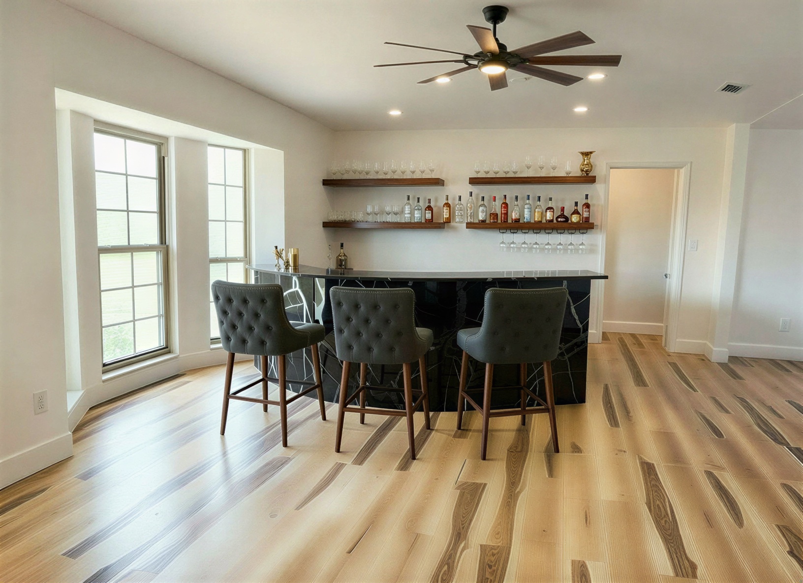add 42 wide tv on the wall in the middle of the shelving behind the bar