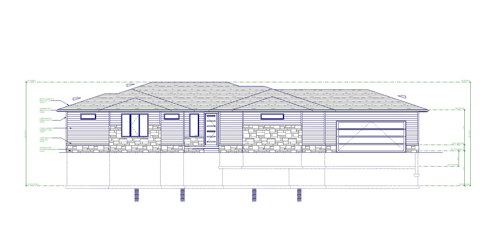 exterior rendering of a prairie style home with black windows dark green earthy siding with limestone stone black overhead doors and charcoal gray asphalt shingles acreage setting for home with prairie grasses and trees in the distance