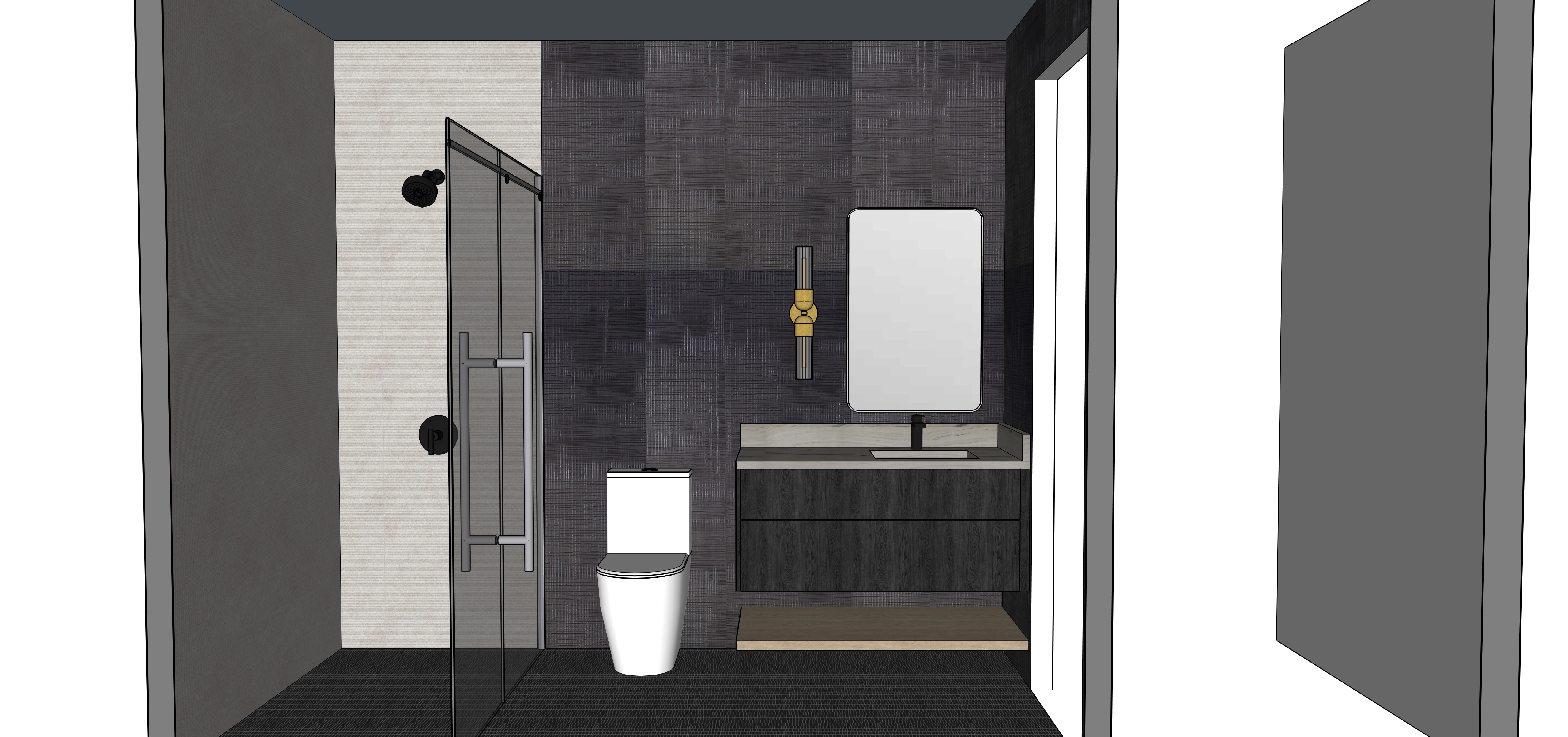 the bath faucet shower head and shower controls are matte black the lower shelf beneath the vanity is light white oak and the vanity is black oak