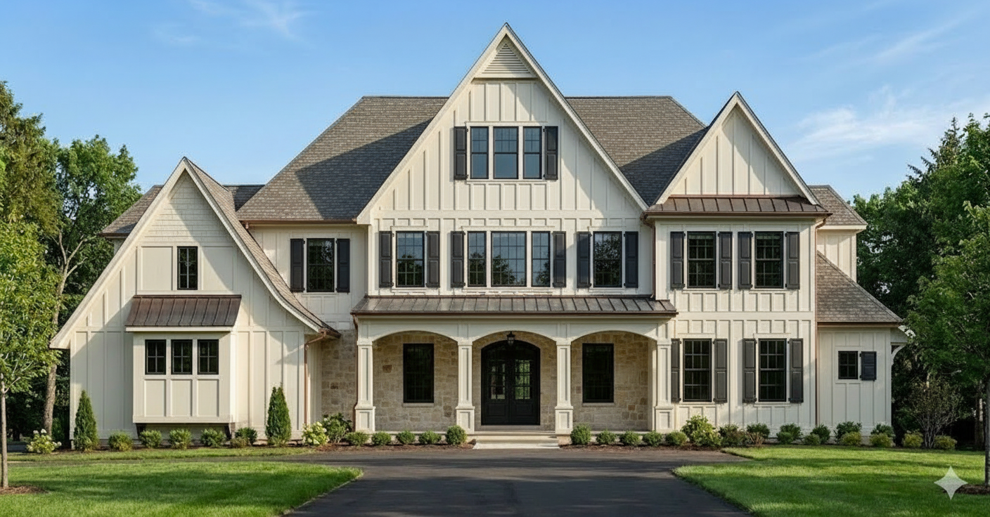 create a photorealistic exterior rendering from this sketch up view use realistic materials accurate scale and natural proportions apply soft daylight with realistic shadows global illumination and subtle reflections enhance textures without changing geometry maintain the original camera angle and composition produce a clean professional real world visualization add a blue sky with clouds in the background
