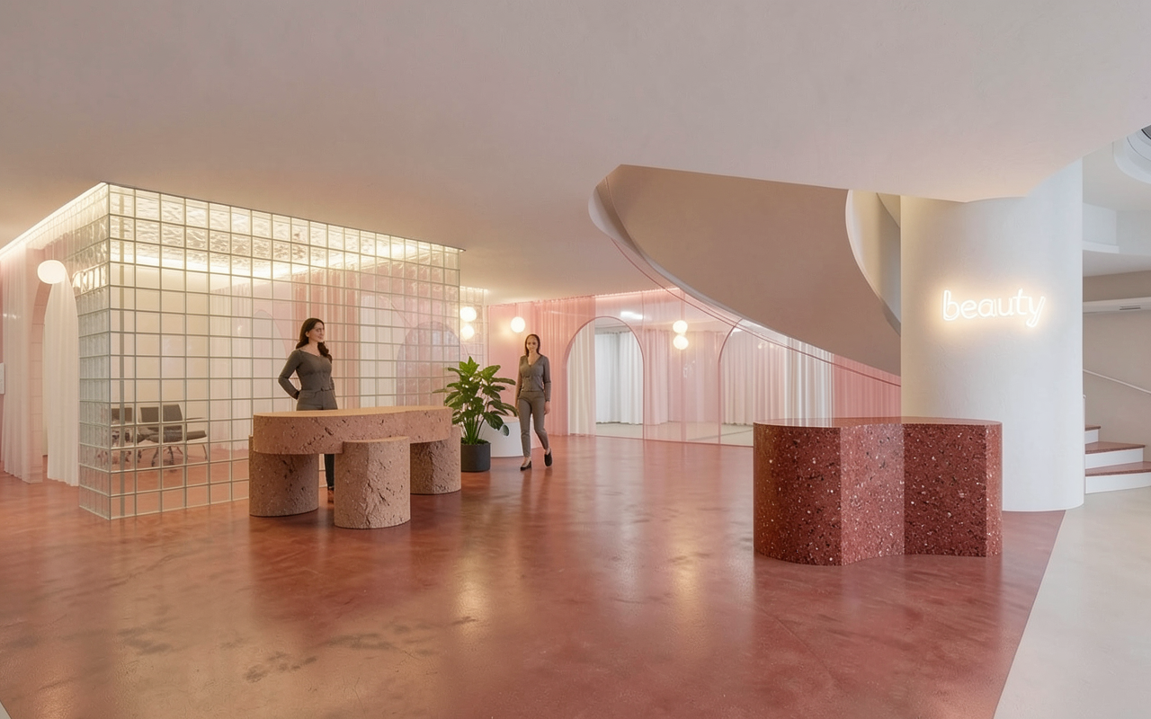 show a light concrete polished floor show an opaque glass brick wall where the current glass brick wall is in a satin finish make everything feel hyper realistic warm lighting and soft shadows show an organic shaped rug meandering throughout the space that slips under both tables in a beige finish