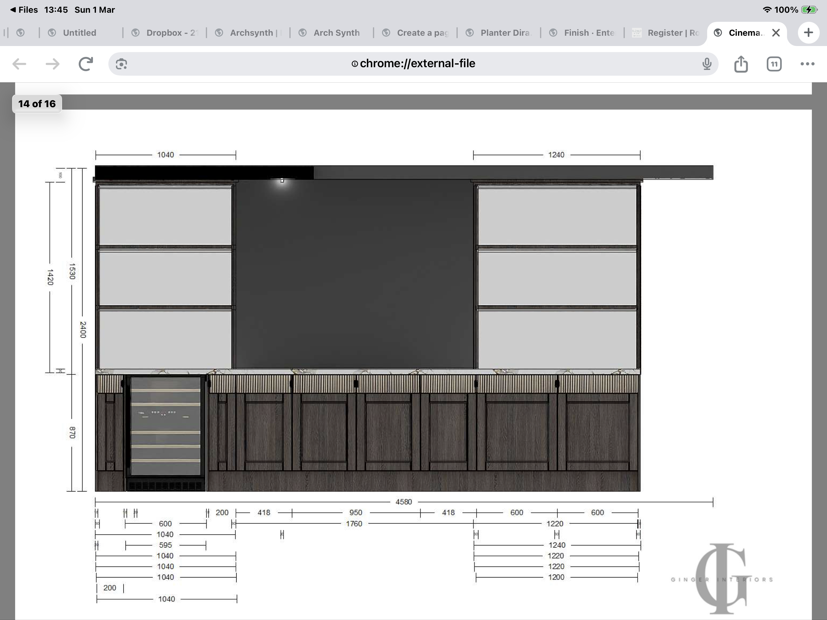 can you create a cgi for the cad drawing above please can you add the fluted design to the top of the cupboards can you also add calcutta porcelain worktops and bronze glass behind the shelving