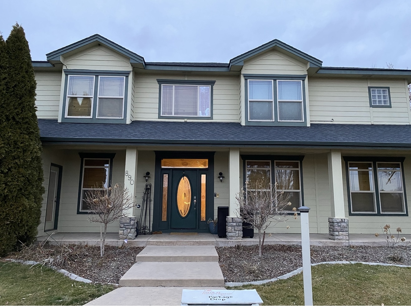 change the house color to white change the trim to black change the trim around the windows to white change the pillars to white stone from top to bottom change the two dormers on the second story to black