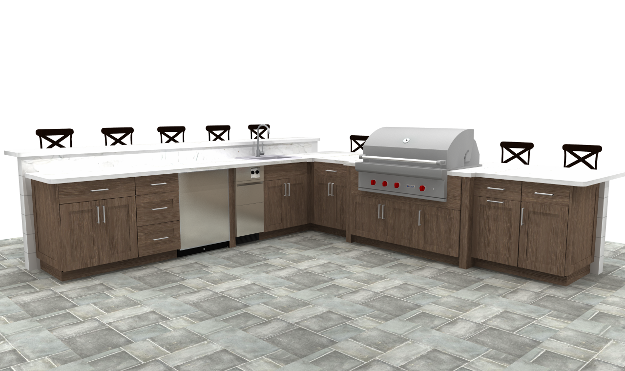 add backyard scenery behind add a platter of hamburgers and hot dogs to the right of the grill add a six pack of beer on the counter to the left of the sink add a stack of plates to the left of the sink add two glasses of beer on the higher counter near the seats