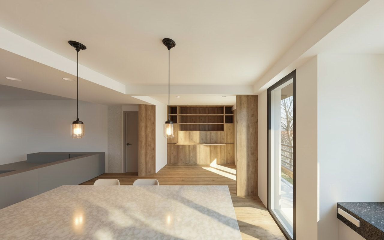 international style interior shot create a nice realistic interior visualization do not change materials maintain correct scale and proportions use physically accurate lighting with soft global illumination and high quality textures ensure precise details with realistic reflections and shadows the lamps are turned on and emit warm light with visible light sources keep natural exposure a nice view is visible through the window do not add stylization or artistic effects the result must be photorealistic withoutthe window sun reflection from the left do not change anything architecture