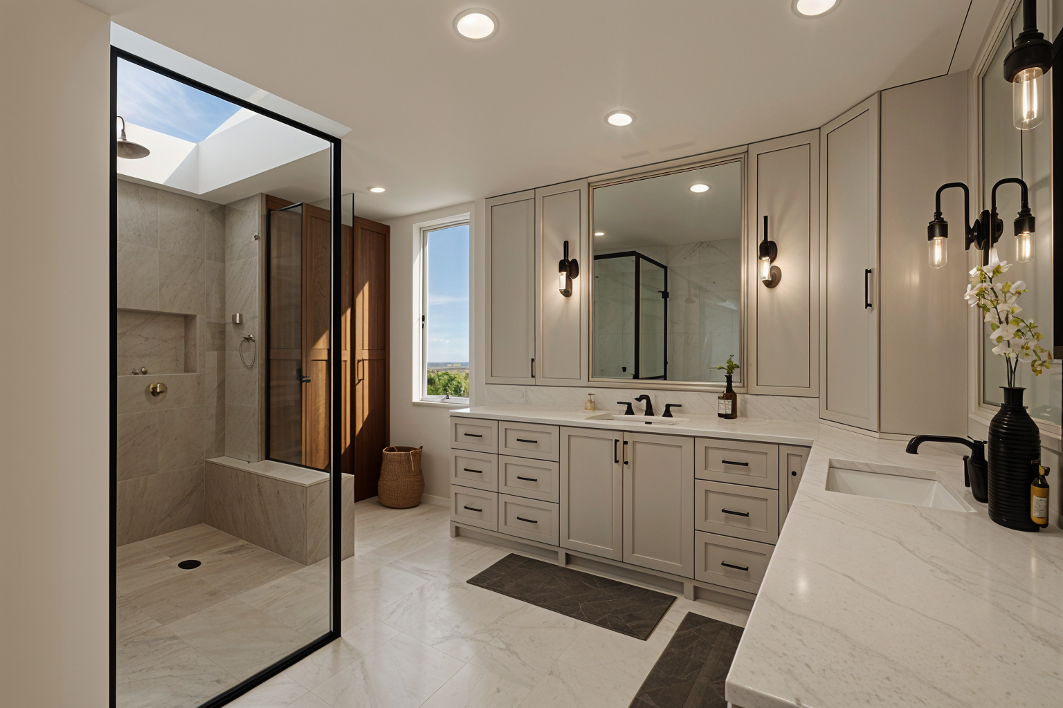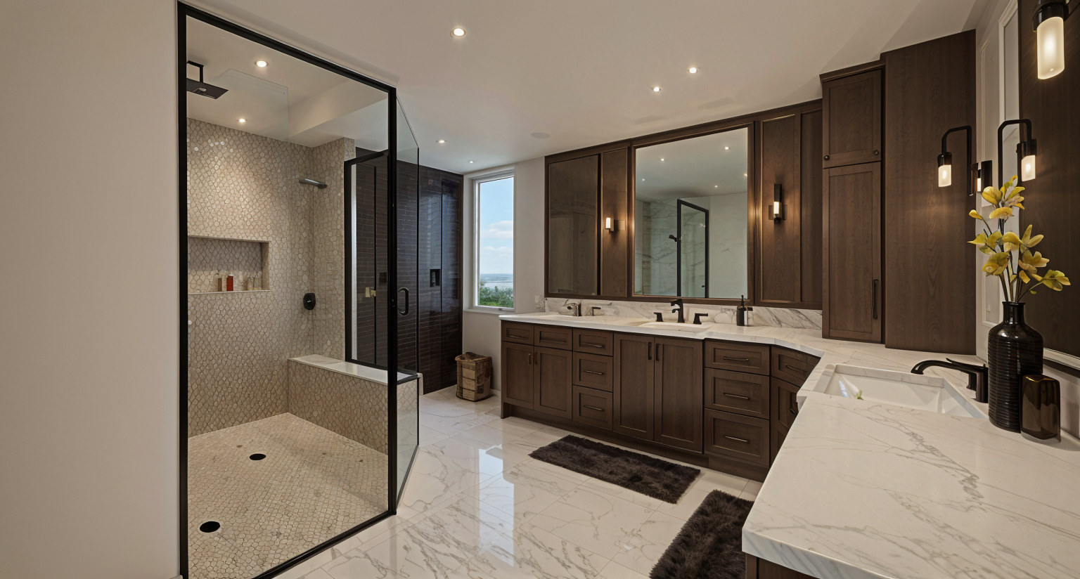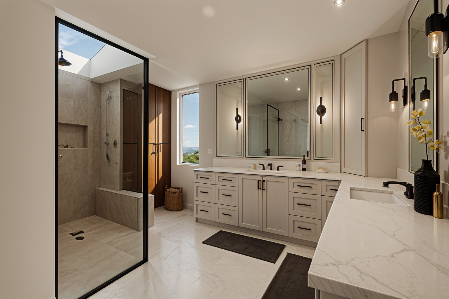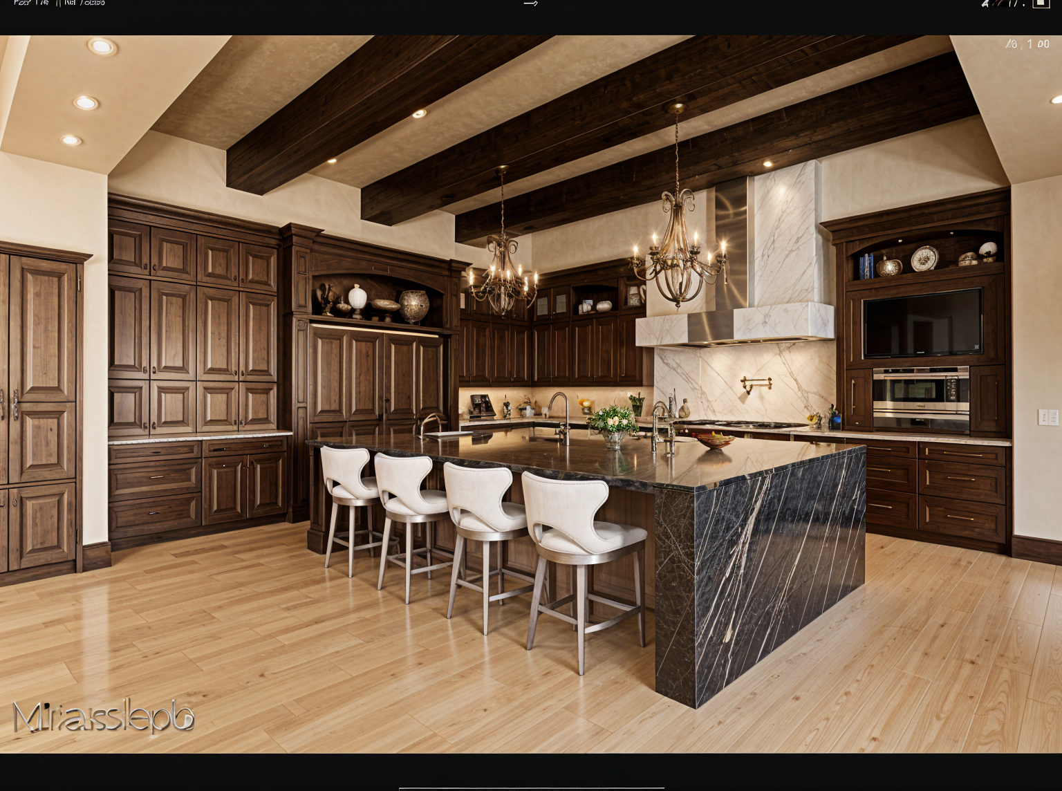 design a striking high end kitchen featuring a wow factor waterfall edge island made of dark natural stone with beautiful veining reflecting a super modern luxury aesthetic include a modern hood vent that has light cream beige natural stone cover with no architectural ornate details with the same stone added to the backsplash give me another hood design with modern elements