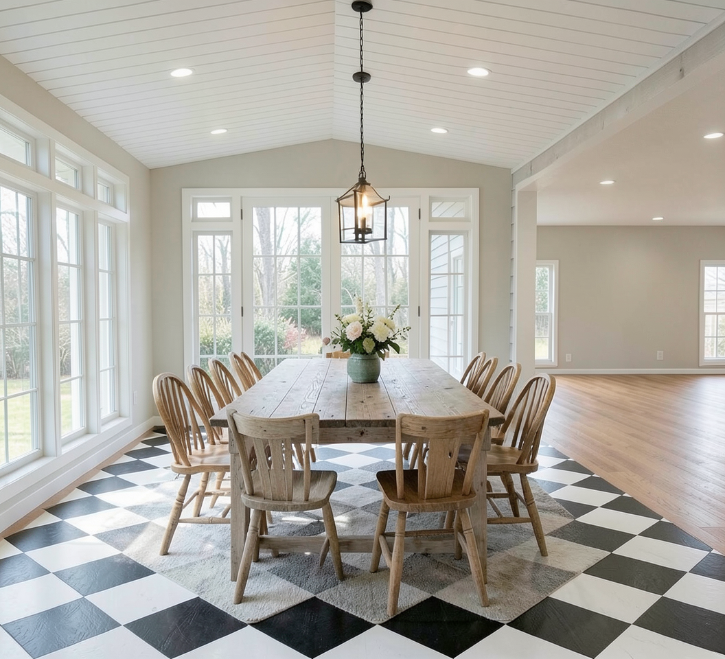 add a farmhouse style table with seating for 8 don t add a chandelier make the table more basic and centered in the room