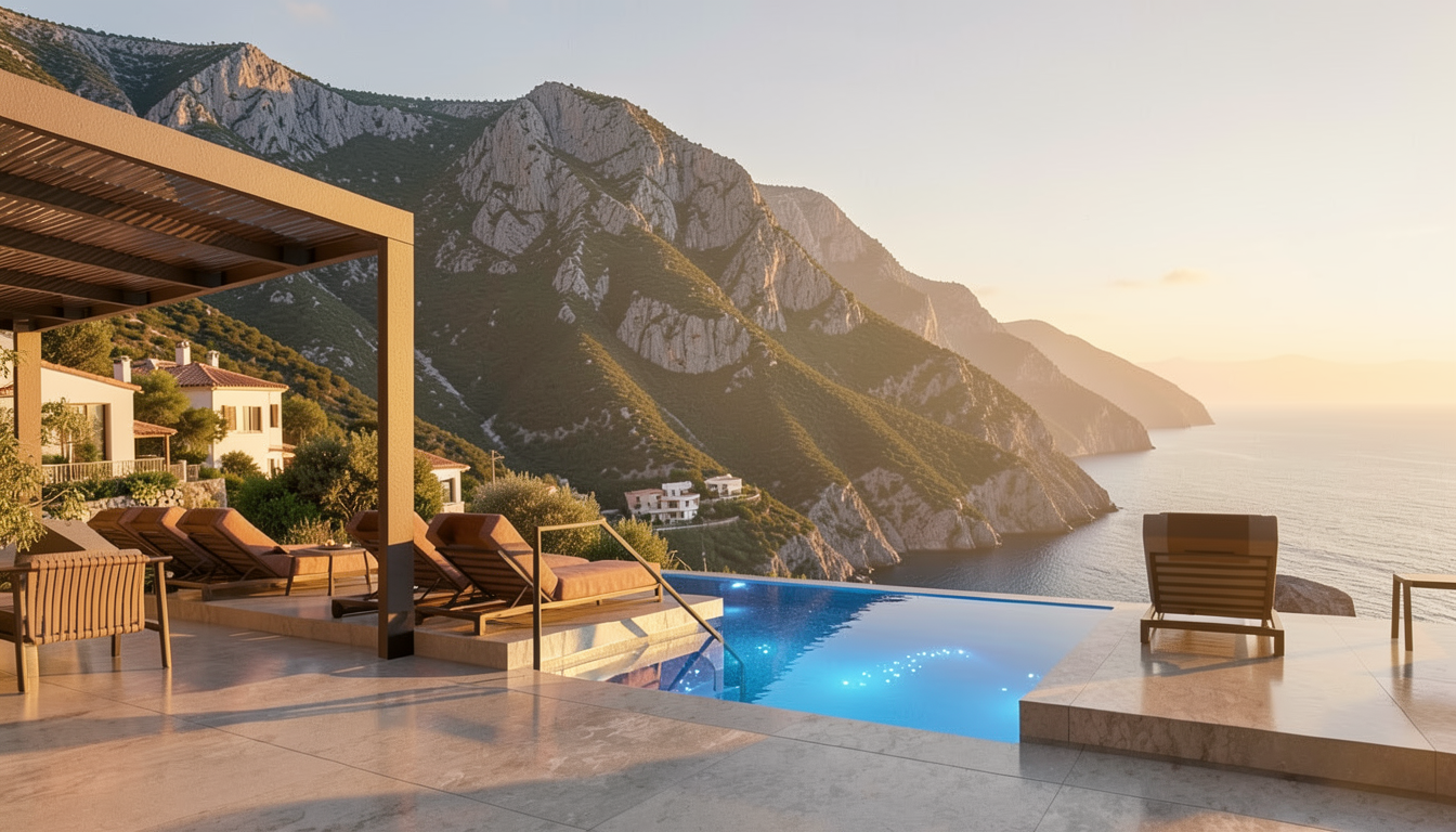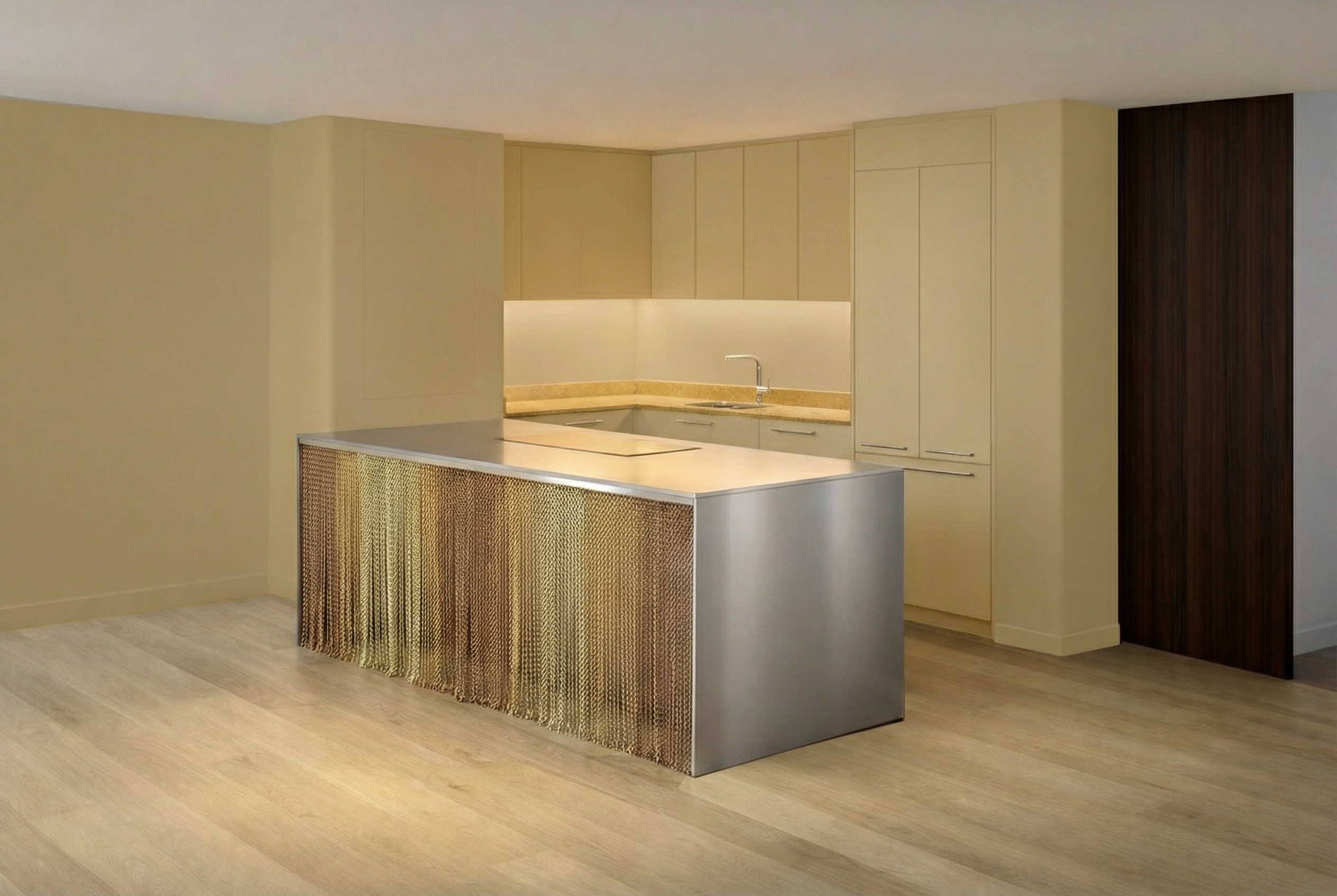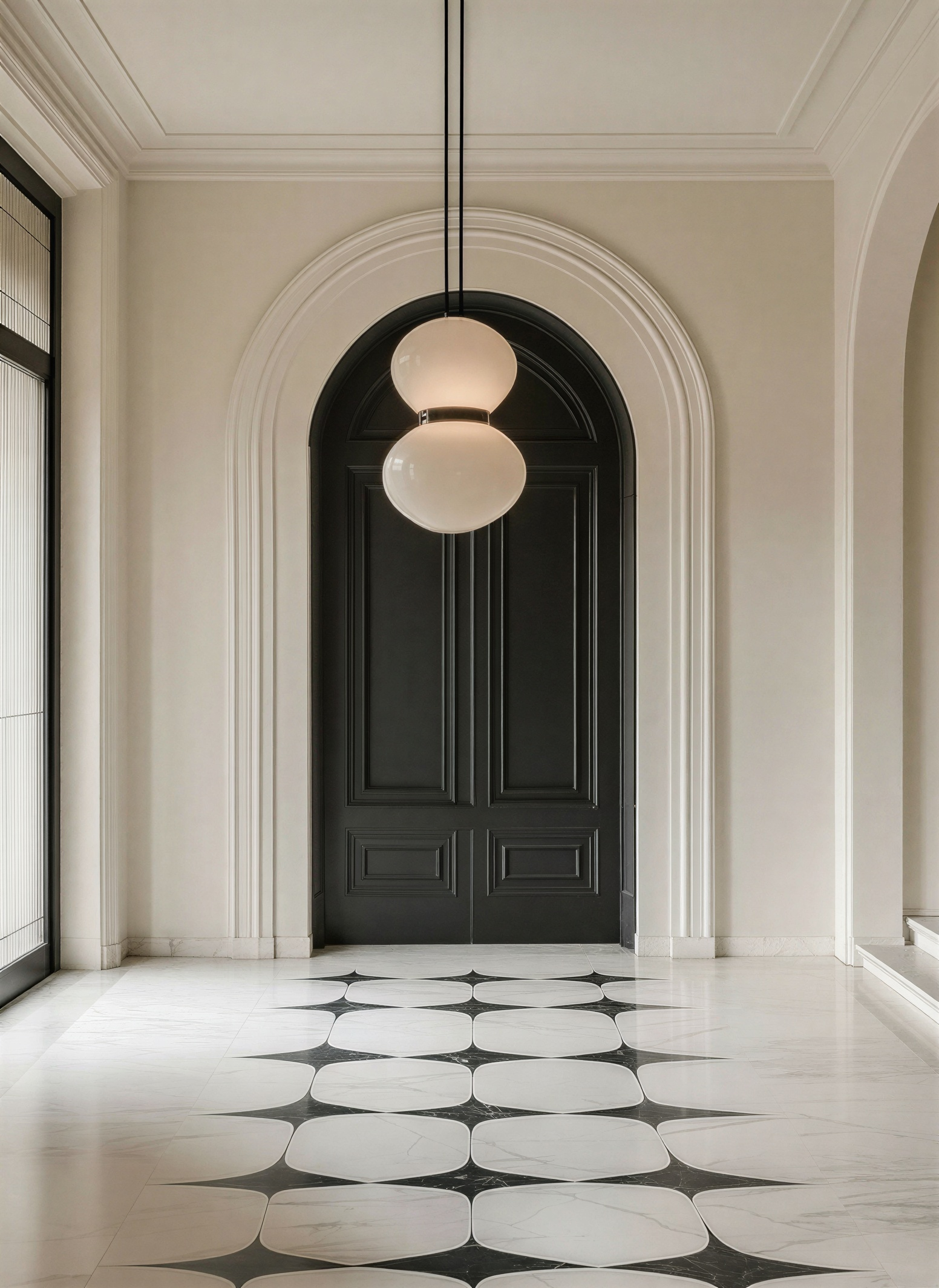 modern luxury living room with high ceilings and elegant archways large black double doors serve as a striking focal point cozy cream colored sectional sofa against smooth neutral walls add touches of greenery with a tall lush plant in the corner black mid century modern armchairs paired with a round dark wooden coffee table dining area features a matching round wooden table with upholstered gray chairs sophisticated decor includes monochrome art pieces and a sleek mounted tv the floor is polished marble with a black and white geometric pattern soft natural light floods through tall expansive windows add a hanging pendant light with globe shaped bulbs and brass accents for a warm inviting atmosphere