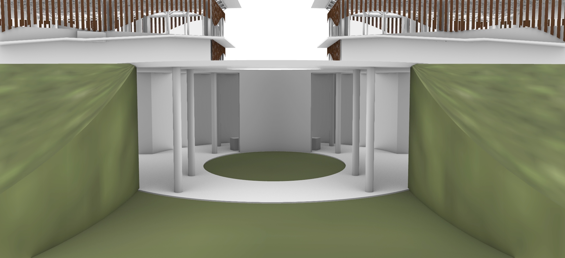 a small lobby surrounded with elevated green contour white concrete column white floor with wood hint small trees in the center room inside is using glass materials architecture