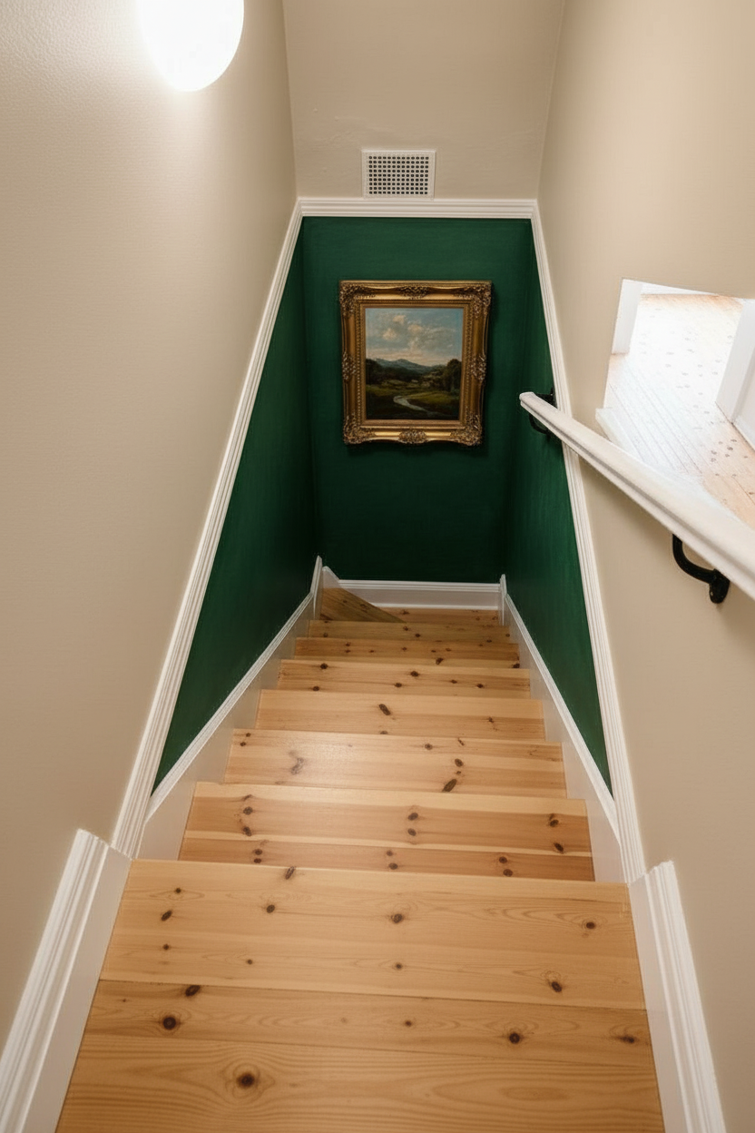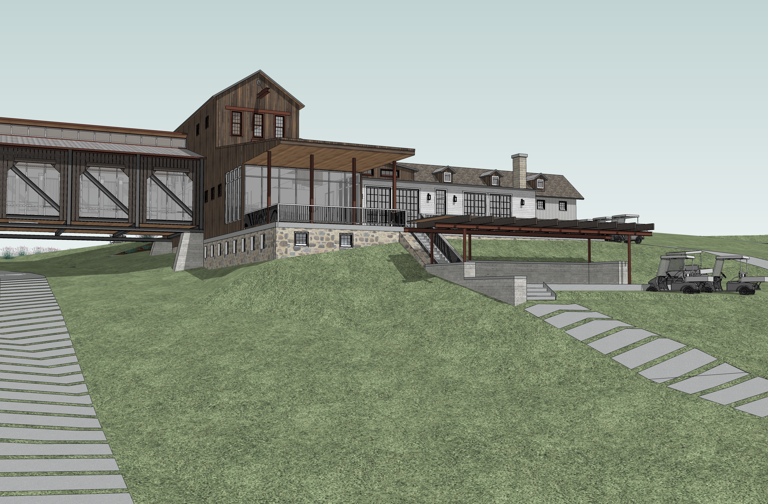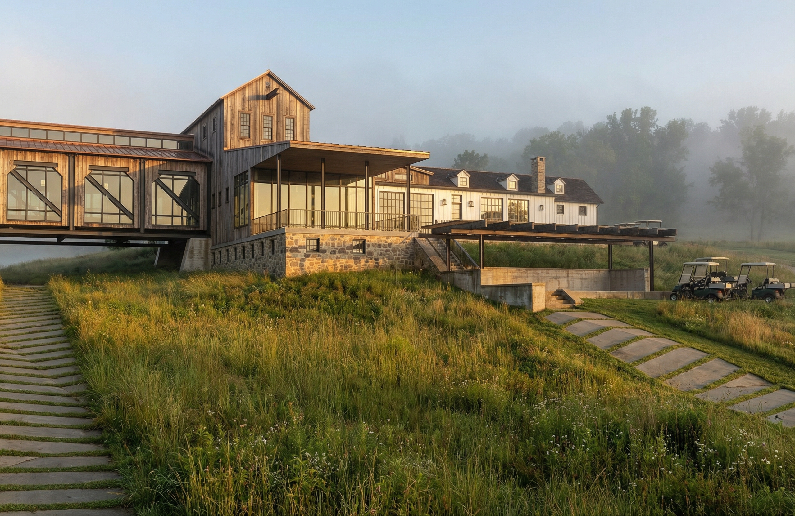 industrial design mill house with vertical matte wood shiplap steel bridge with wood slats old stone farmhouse with carriage house attached tall grass foreground trees in background sunlight on building face fog small creek running under bridge