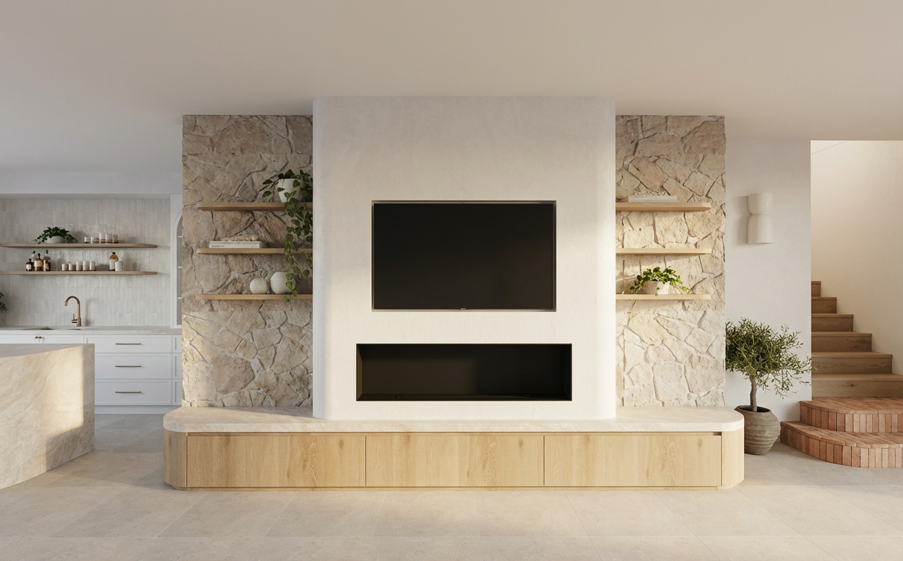 crazy stone wall have a rough surface taj mahal stone light oak timber tiled floor bottom two risers on stairs have this tile stacked https www tilesofezra com products ezr1550 thin dust bejmat wall sconce is this https www mcmhouse com products uno owan wall sconce and is a white plaster finish kitchen cabinetry is white middle section of fireplace is white microcement