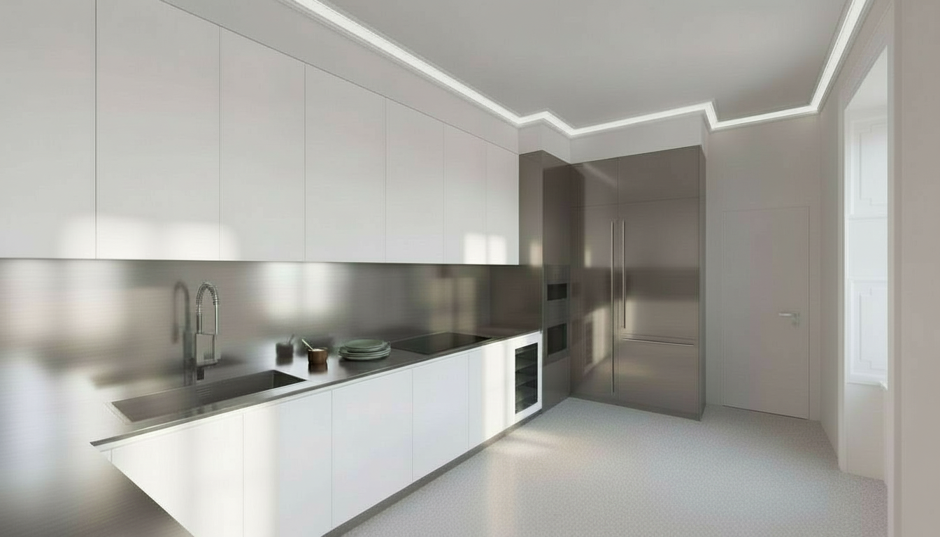 edit the reference kitchen image while preserving exactly the original architecture layout proportions perspective camera angle cabinetry design openings appliance positions lighting mood and overall minimalist aesthetic requested changes 1 stainless steel finish keep the countertop and backsplash in a stainless steel finish inspired by boffi o steel the metal should look like a soft matte industrial stainless steel slightly brushed refined elegant contemporary with subtle texture and controlled reflections avoid mirror polished or overly glossy metal apply the same o steel inspired stainless steel finish also to the built in appliances and the tall appliance wall at the back so all visible appliance fronts and technical panels in that area match the same material language 2 floor material replace the floor with a terrazzo inspired by grandinetti fragmenta 305 carrara luminoso the floor should have a bright white base with fine and medium carrara marble fragments in light grey white tones the overall effect should be luminous clean elegant and premium with a refined italian terrazzo appearance 3 ceiling adjustment lower the ceiling so that it is only 10 cm above the top of the wall cabinets keep this ceiling change minimal precise and architecturally realistic maintain the recessed perimeter ceiling detail shown in the reference image 4 ceiling frame border finish make the ceiling perimeter frame cornice exactly the same color and finish as the suspended ceiling the whole ceiling composition should read as uniform integrated and minimal avoid contrast between the ceiling border and the main suspended ceiling plane 5 door handle update replace the current door handle with a much more discreet model use a minimal almost invisible handle integrated into the door design the handle should be elegant contemporary understated and visually unobtrusive important constraints do not change the kitchen composition cabinet layout dimensions door position wall geometry window openings sink cooktop oven placement or camera framing keep the white cabinetry exactly as in the original image preserve the tall storage appliance volume in the same position and design only updating its visible finish where requested preserve the ceiling geometry shown in the reference only refining its height and finishes as requested maintain the same clean contemporary minimalist design preserve the soft natural daylight and neutral color balance the image must remain a photorealistic architectural render goal create a premium contemporary kitchen visualization with realistic material replacement only accurate texture mapping and scale subtle and believable stainless steel reflections a bright elegant terrazzo floor a lowered ceiling integrated naturally above the cabinets a uniform ceiling frame matching the suspended ceiling and a very discreet almost invisible door handle