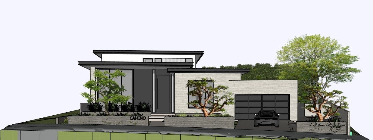 hi end residence limestone raked black basalt stone dark wood front door soft daylight semitransparent windows