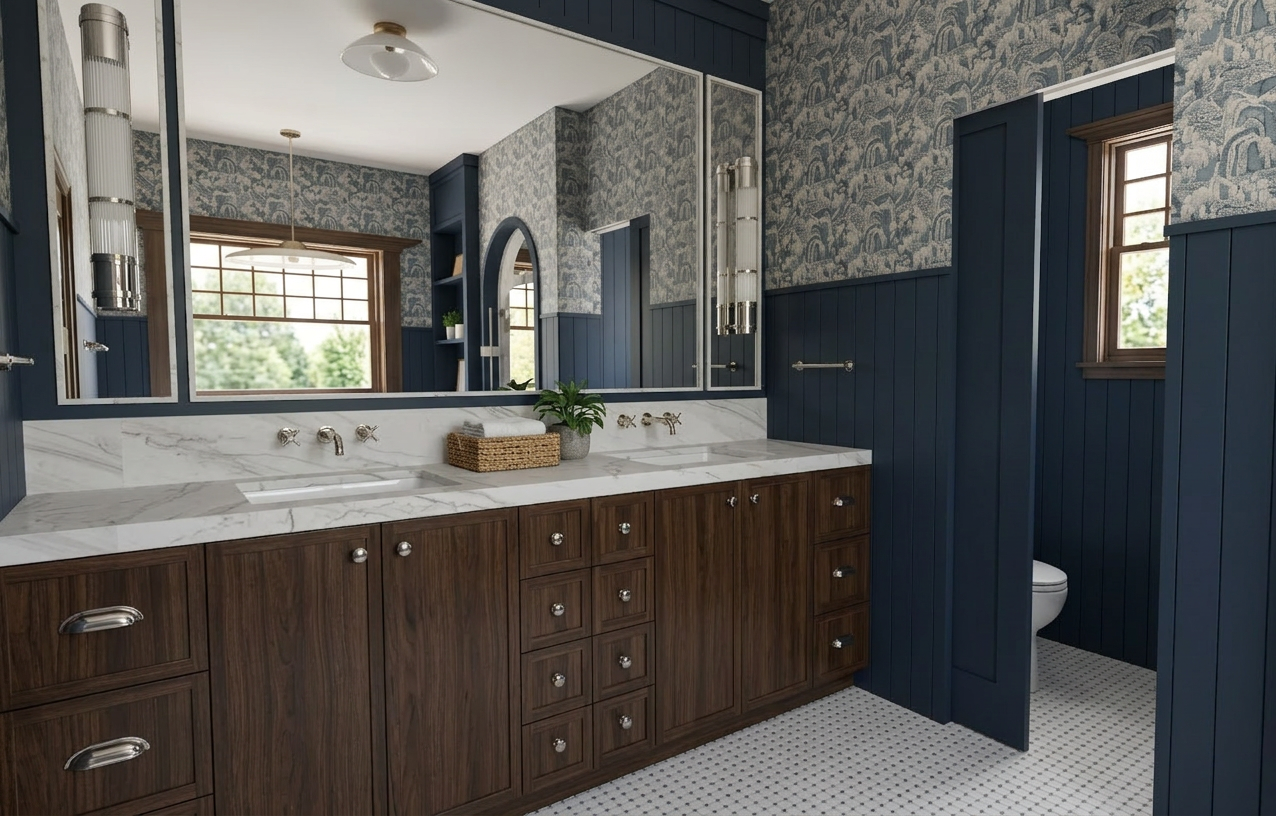 make the wall on the right the same material as the cabinets woven wallapper