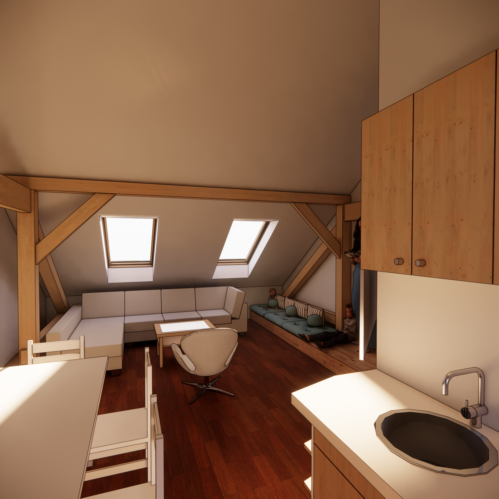 cozy attic room with a warm and inviting atmosphere featuring light beige walls and wooden beams in a soft oak finish the skylights bring in natural light casting gentle shadows across the space the l shaped couch in a soft gray fabric complements the plush teal floor seating surrounded by striped cushions the dark cherry hardwood floor adds richness and the compact kitchenette features light wood cabinets with a sleek stainless steel faucet the overall ambiance is peaceful and welcoming perfect for relaxation