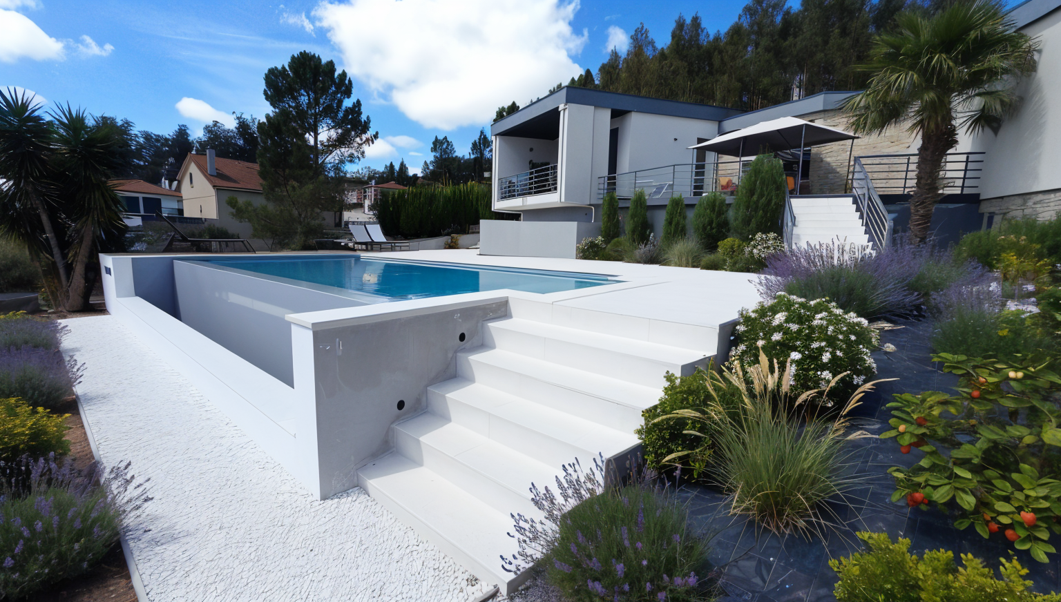 mediterraneum tall shrubs lavender rosemary myrtus stipa strawberry tree in front of dark grey damaged wall remove vegetation on left background