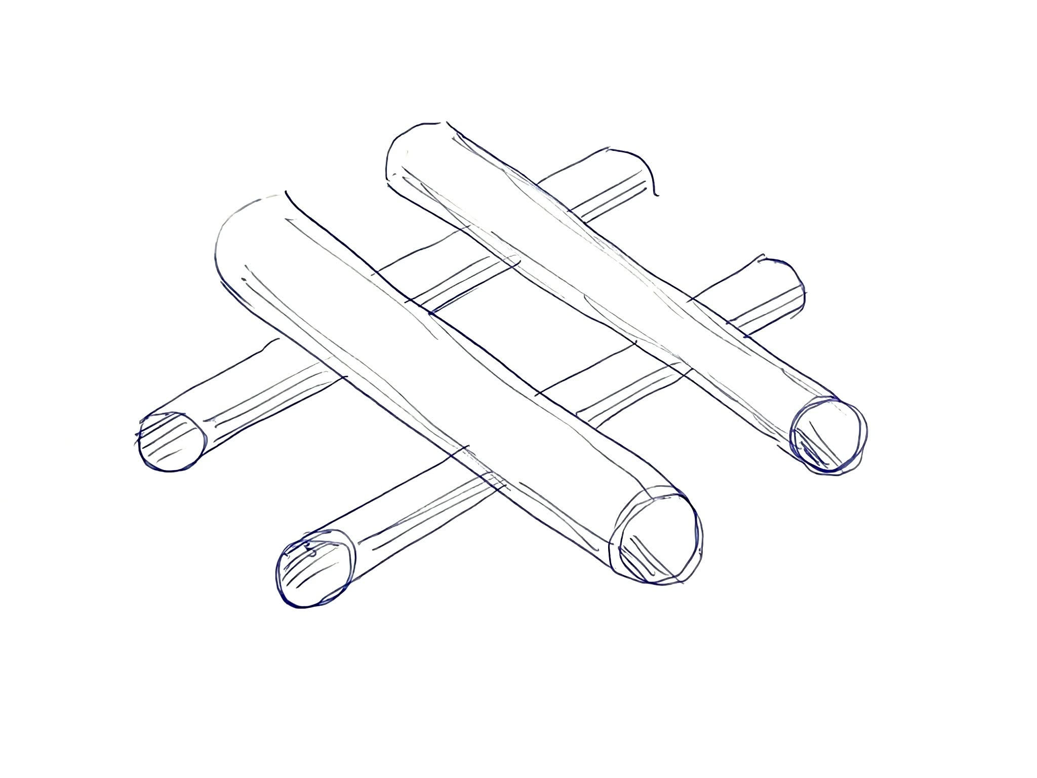 composici n con 4 cilindros cer micos de textura rugosa su longitud es de 70 cm y su di metro 10 cm estando separados entre s otros 10 cm los que est n situados en la fila superior est n girados 90 grados sobre la fila inferior