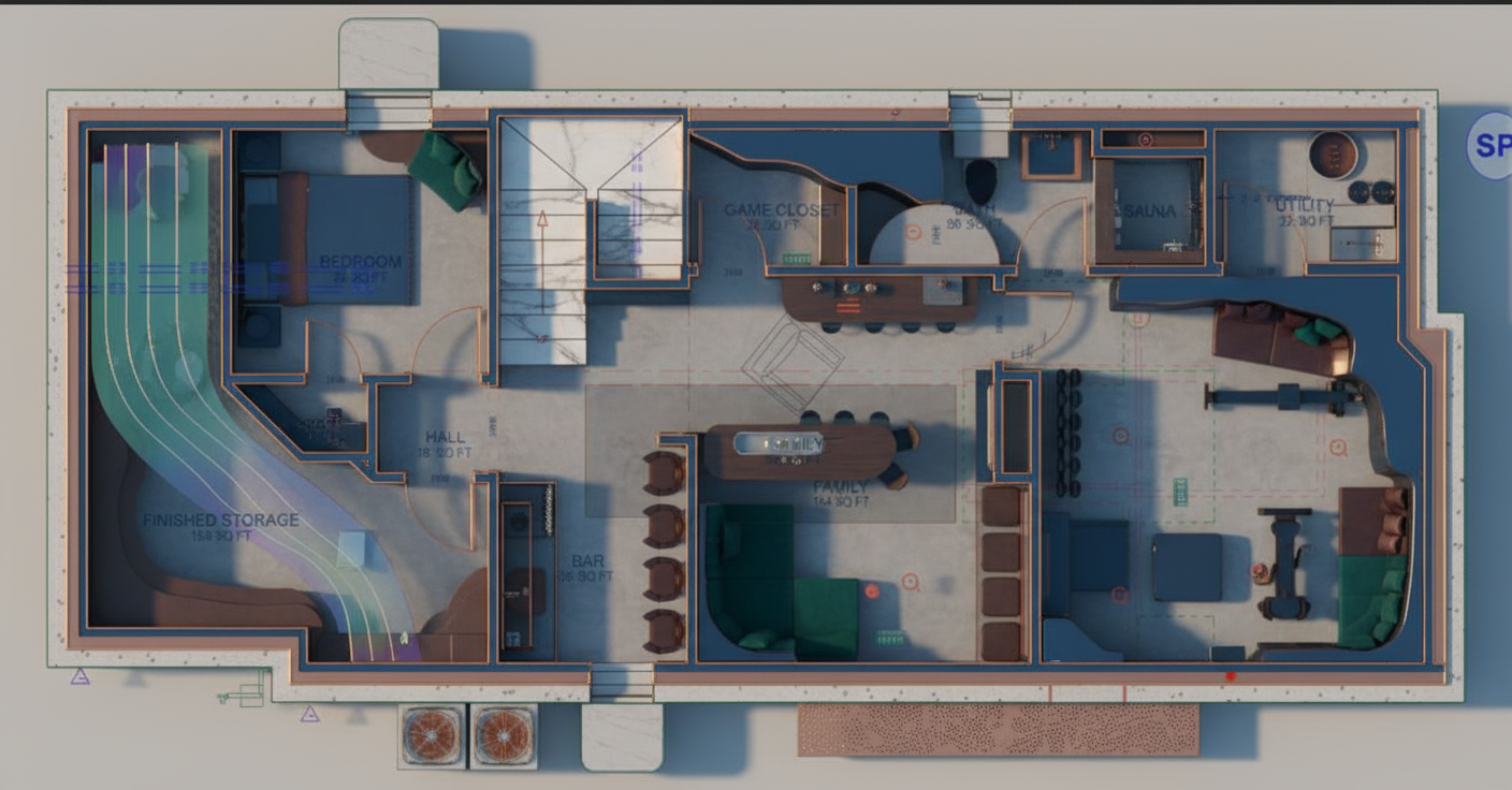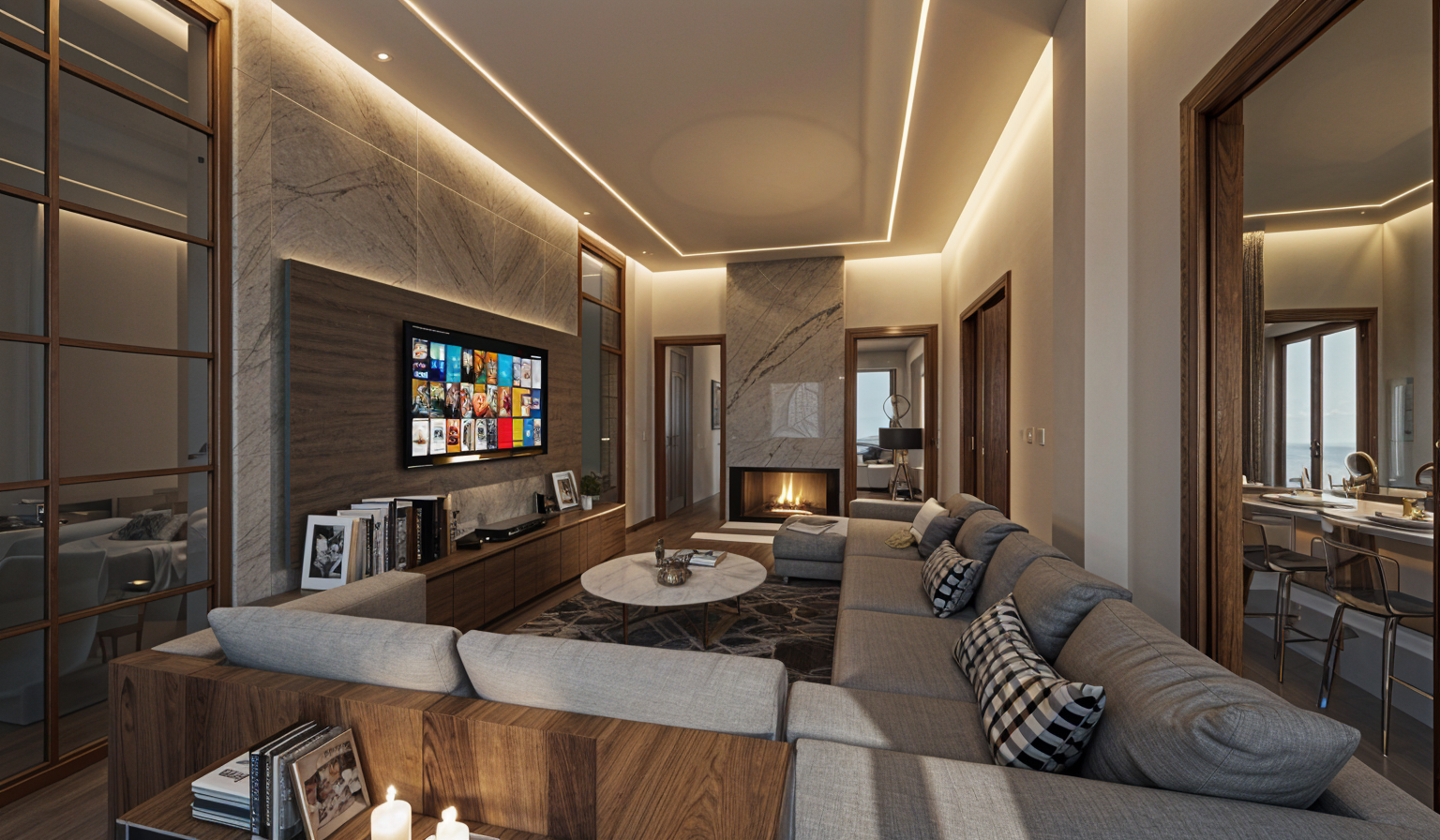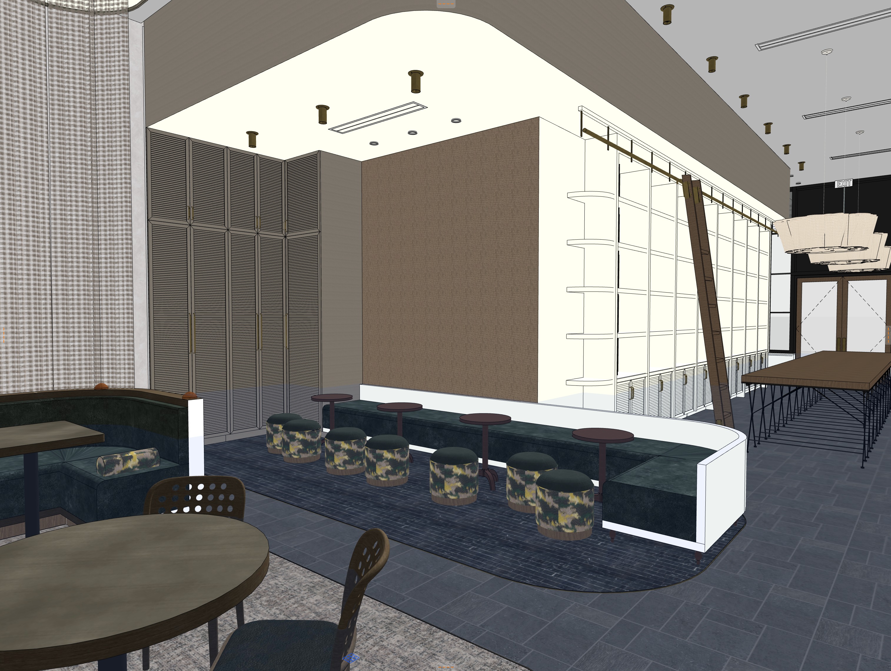 add art books on the shelves in the right side of the image the bookshelves do not wrap the corner on the left side of the image there is a woven wall covering on the middle wall and louvered painted closet doors on the left hand wall the closet doors do not continue behidn the curtain there is just painted wall behind those the louvered closet doors are painted a deep metalic warm grey color there is no natural light coming from left side of image setting should be moody with lights on from above