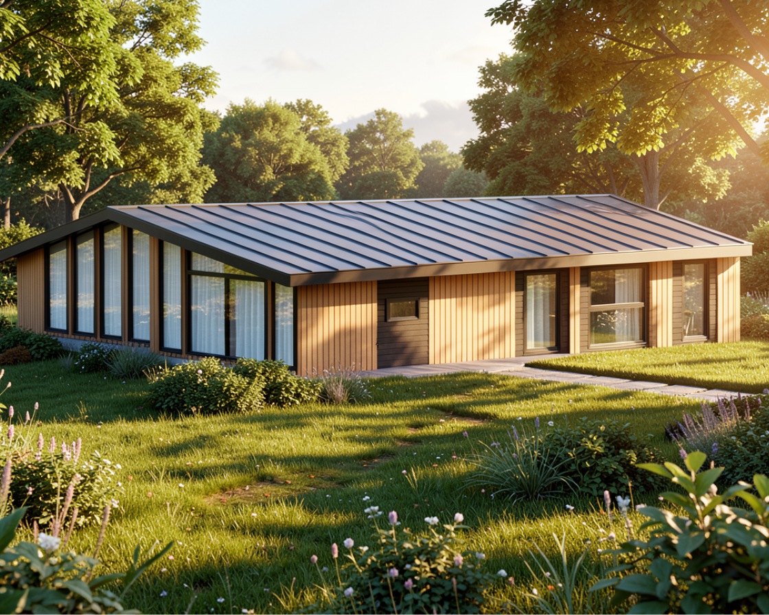 camera positioned at eye level approx 1 6 1 7 m height 35 45 mm focal length view showing the front facade and the adjacent side facade corner perspective