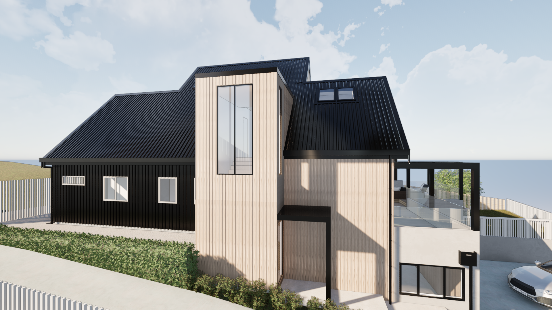 enhance add small neighbouring houses new zealand light oak black trapezoidal metal and smooth concrete cladding