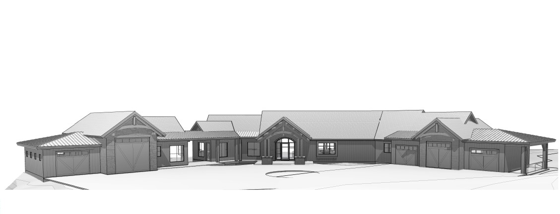 the upper roof is grey asphalt shingles the lower pitched roofs are black standing seam metal the siding is a brown wood tone the stone is a rustic brown chief cliff