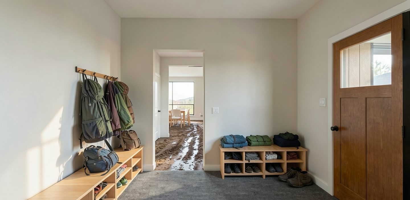 a hyper realistic high resolution architectural photograph rendered as a strict 2d flat elevation directly from image 4 png the viewpoint is perfectly frontal and orthogonal with absolute respect for the rectilinear geometry window placements and door grid defined in image 4 png the building facade is clad in warm charcoal grey textured concrete panels contrasted with linear horizontal cedar wood slatting the central multi panel door assembly is rendered with dark metal framing and integrated warm amber tinted glass panes all three matching square windows feature precise black metal grid frames as shown in image 4 png high end materials polished brass accents on the door hardware and exterior linear wall sconces the foreground is a pristine concrete paver patio natural soft diffused late afternoon sunlight casts subtle defined geometric shadows background includes a level green lawn and a distant blurred screen of mature olive trees under a clear pale blue sky photorealistic textures of concrete aggregate wood grain glass and metal are ultra detailed 8k ultra hd cinematic composition neutral color palette with sophisticated accents