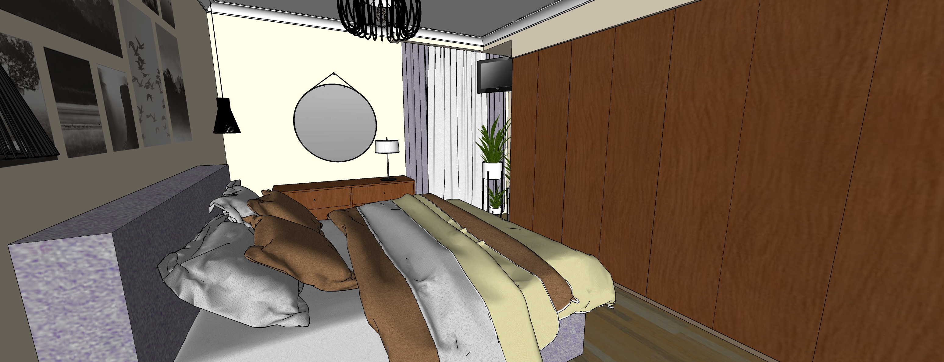 a comfortable bedroom with warm lighting at night time just a little moonlight coming through the window