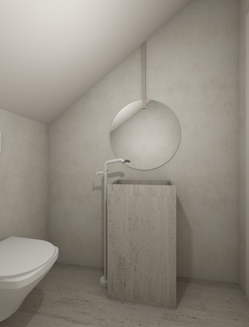 realistic high resolution render the wall has a light beige cemento effect there is a circular mirror slightly larger in scale enhancing the sense of space above it a thin vertical wooden slat extends from the top of the mirror up to the ceiling adding a subtle architectural detail the overall atmosphere is calm minimal and refined with natural materials and a clean architectural aesthetic the celling is white the only light sources are ambient light