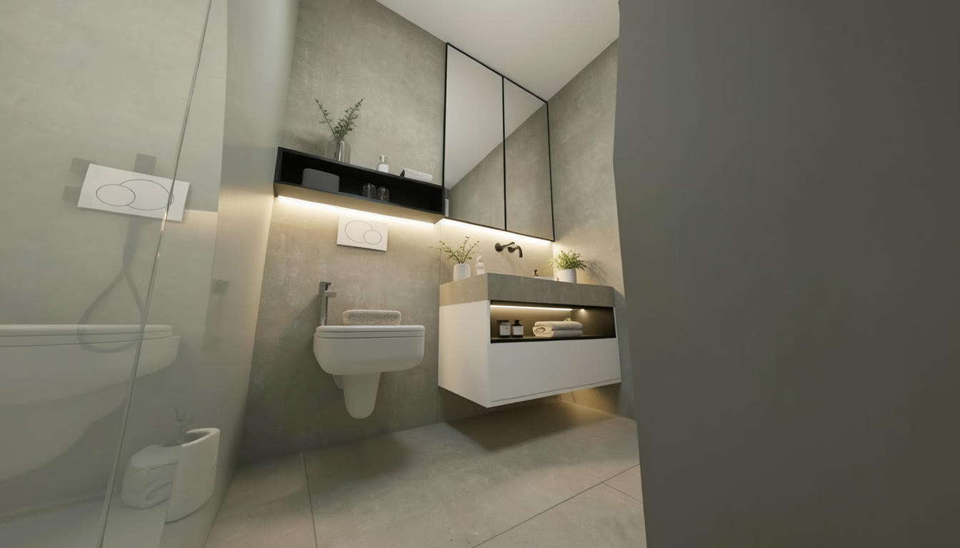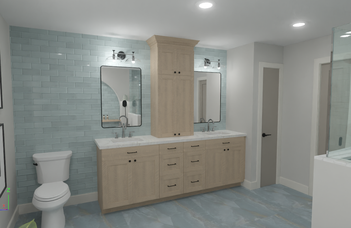 create a serene modern bathroom with a soft calming atmosphere focus on light blue subway tiles for the shower and feature wall complemented by light grey walls include a large curved white freestanding bathtub the floor should have a marble texture in soft shades of grey and blue add a wooden shelf with minimalist decor like a small plant and bottles include a tall green plant in a dark blue pot near the window use soft diffused lighting to enhance the tranquil mood make photorealistic do not change colors as in my original image