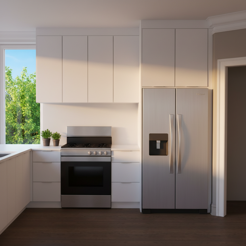 modernist interior shot white box aside from floors and appliances greenery through window architecture