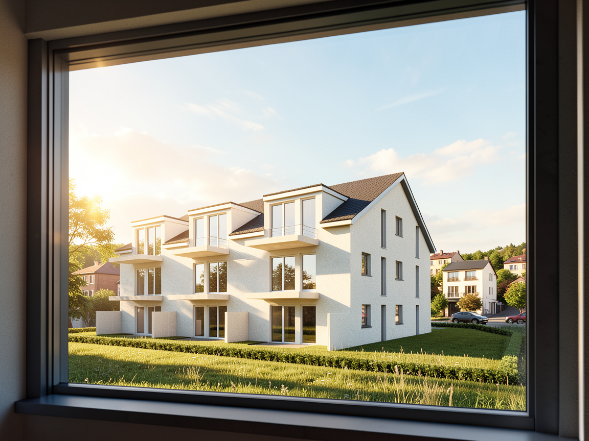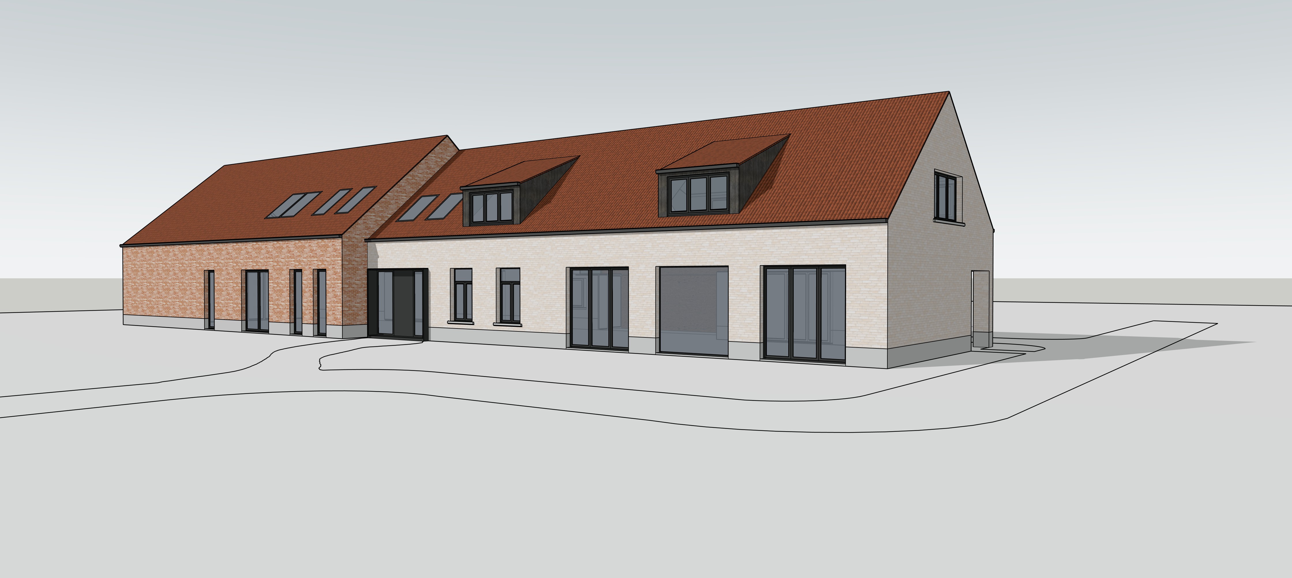 it is a sunny day with few clouds add grass and small bushes the sun is at the left side of the building in the back there can be some small trees