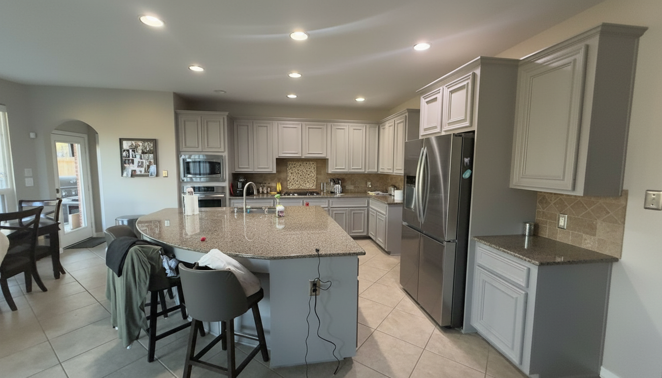 reate an ultra realistic image without changing any of the structure shape design or materials don t resize the jpeg use a glossy light beige floor white marble top table kitchen and island warm off white wall white window off white cabinet kitchen grey roller blind