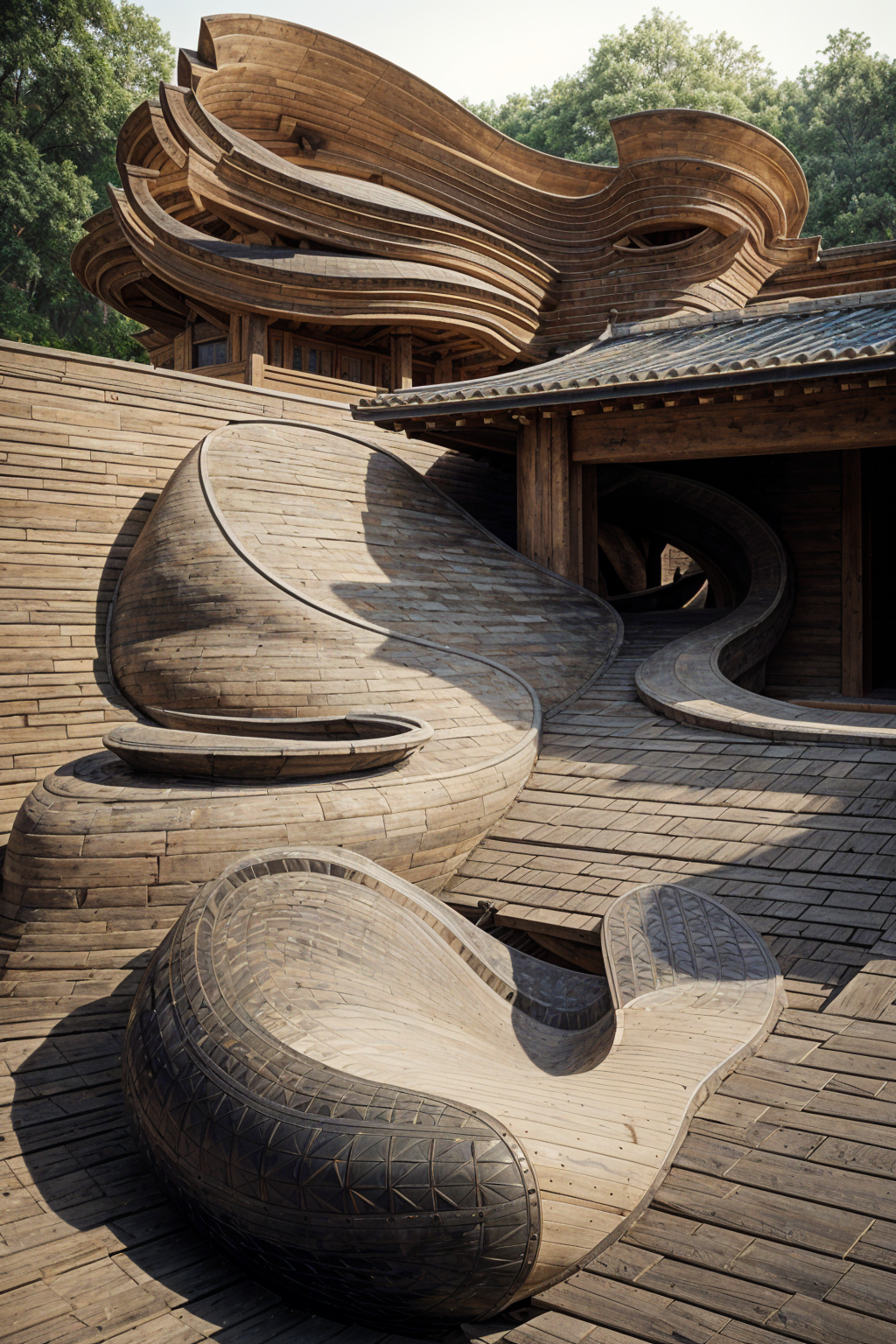 sarineen exterior shot make it as a nature and wooden earthy chinese roof concept look located in shanghai architecture