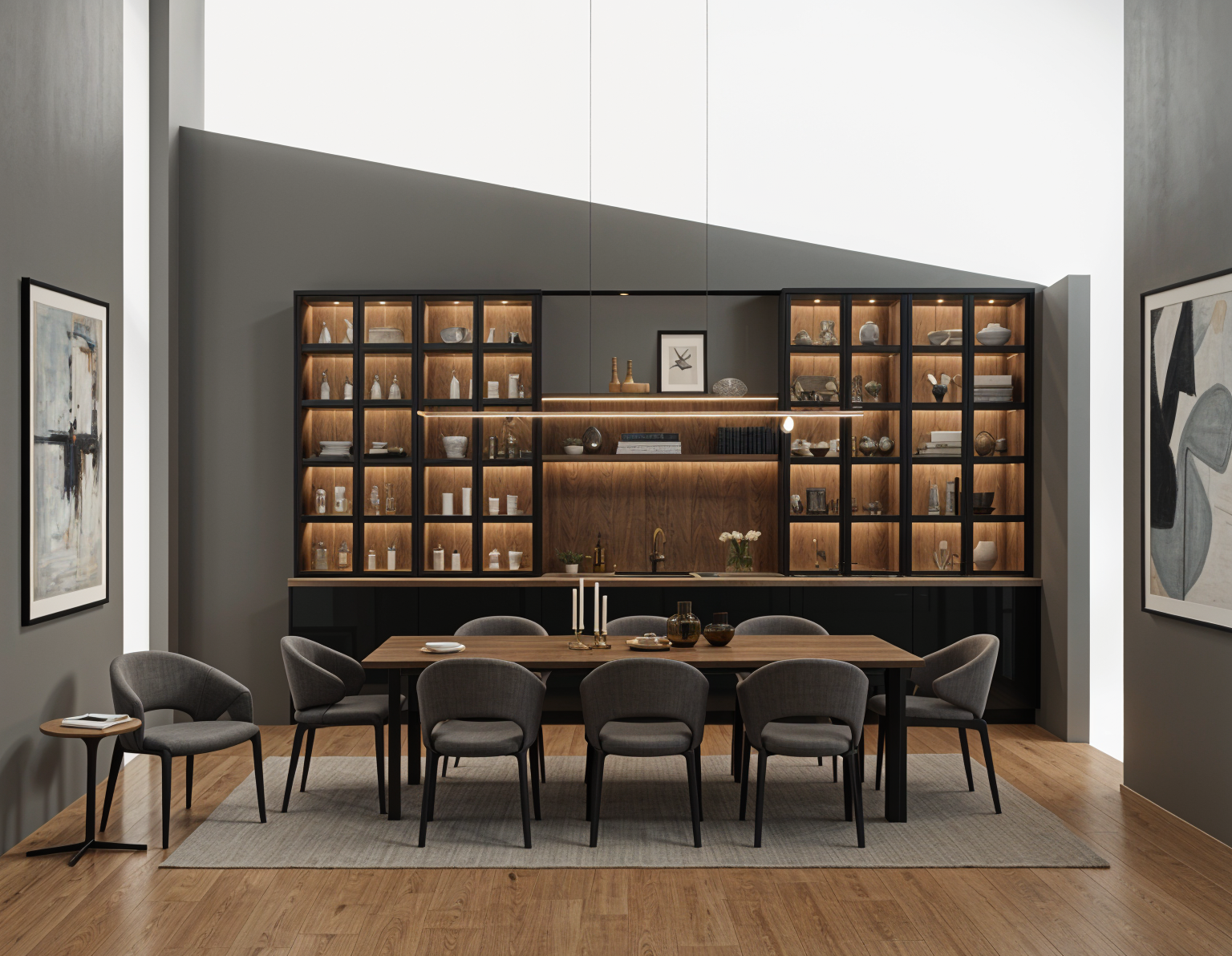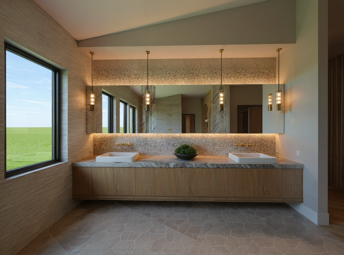 turn this blue print into a 3d primary bedroom the wall with the door is 10 feet tall and the ceiling runs up to the opposite wall that is at 16 feet high fill with clean but open boho room