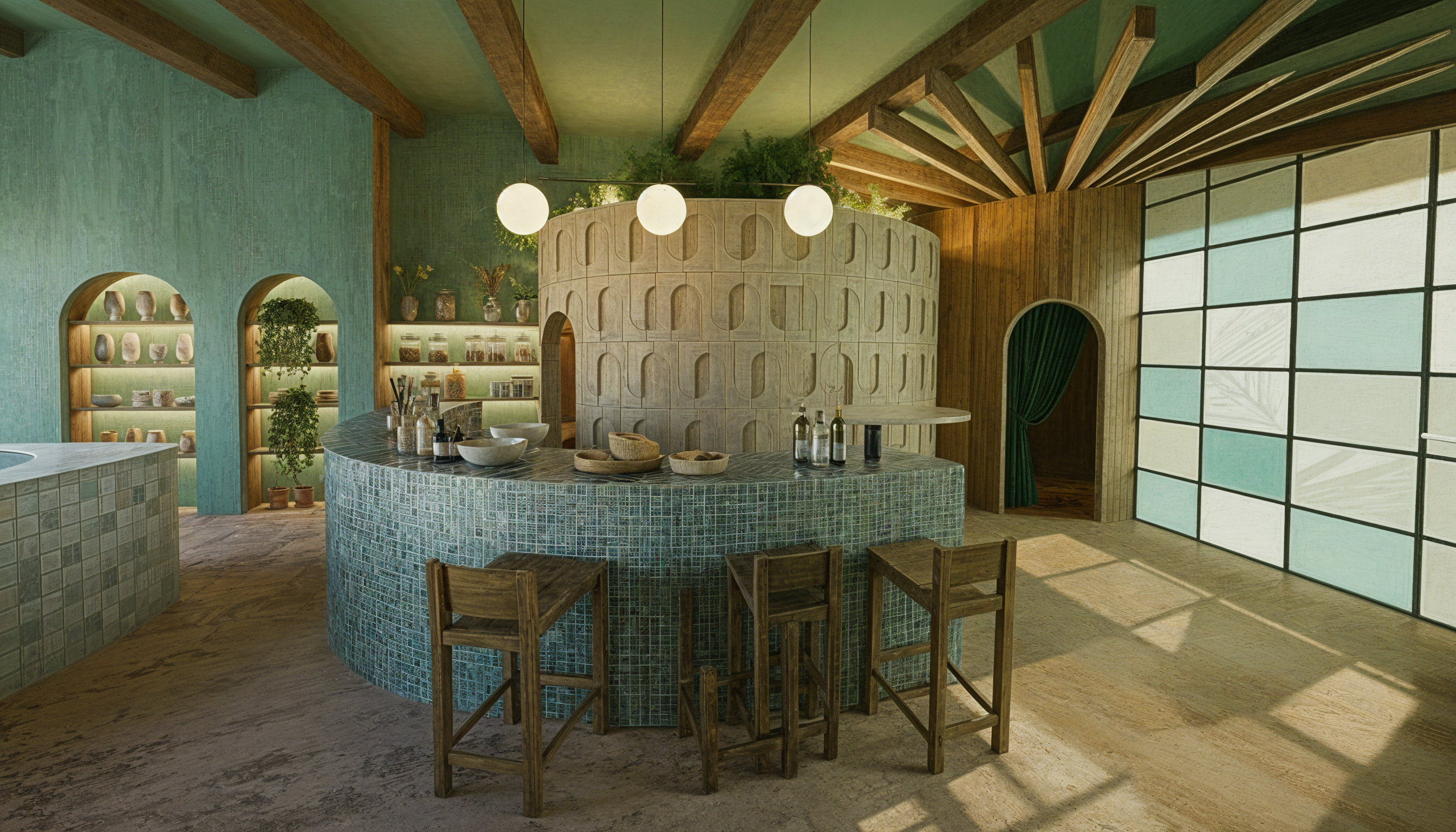 keep aspect ratio zoomed out and wide add these masks hanging on the green wall above the green arches