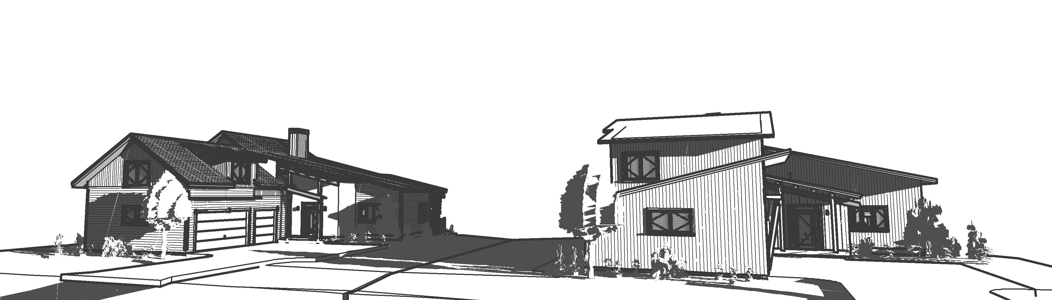 tan siding on the house on the left dark siding on the house on the right sunset from the right side low mountains in the distance