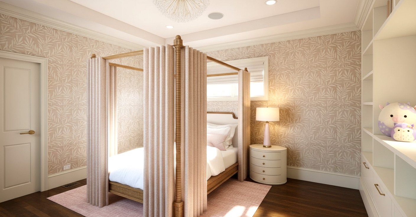 change the bedframe material to wood with a smooth natural finish remove the piping and any upholstered details keep the overall shape and color tone consistent with the rest of the design