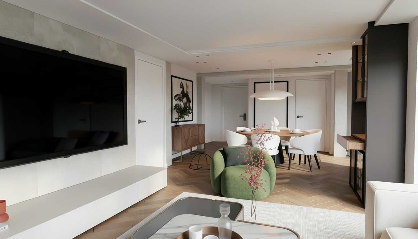 por favor genera una imagen fotorealista mejora texturas y elimina el ruido no modifiques el mobiliario el tejido de las sillas es mas liso blanco pero liso la lampara que hay sobre la mesa de comedor tambien es blanca el sillon de una plaza es verde musgo oscuro elimina la lampara que has puesto en el centro al fondo hay dos puertas y un cuadro con marco negro pero no se ve luz a traves no modifiques la lampara