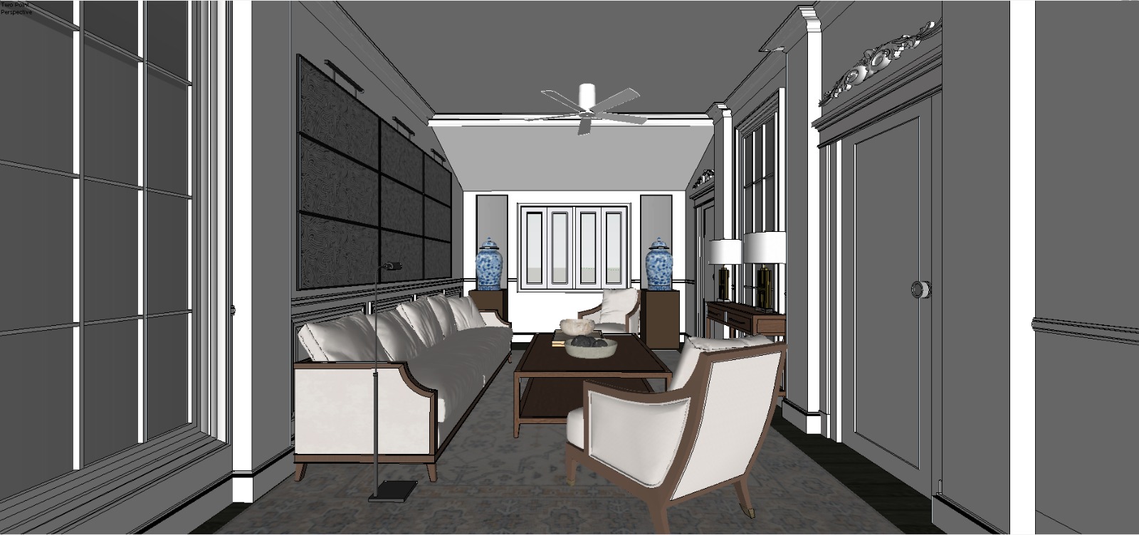 this is a living space all walls and ceiling in white the floor in white marble and grey veins the carpet in light beige the back window shows the greens outside