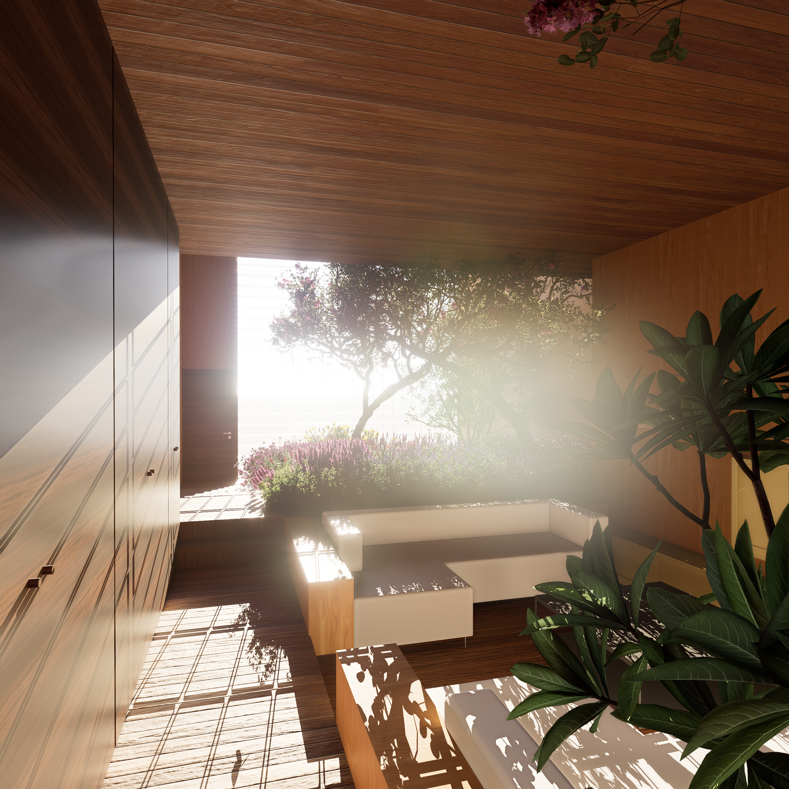 haz el render hiperrealista haz que la luz sea menos intensa y mas agradable haz que los materiales sean de madera muy elegante a ade un hombre sentado en el sofa y en la vegetacion del fondo a ade una mujer leyendo en una tumbona