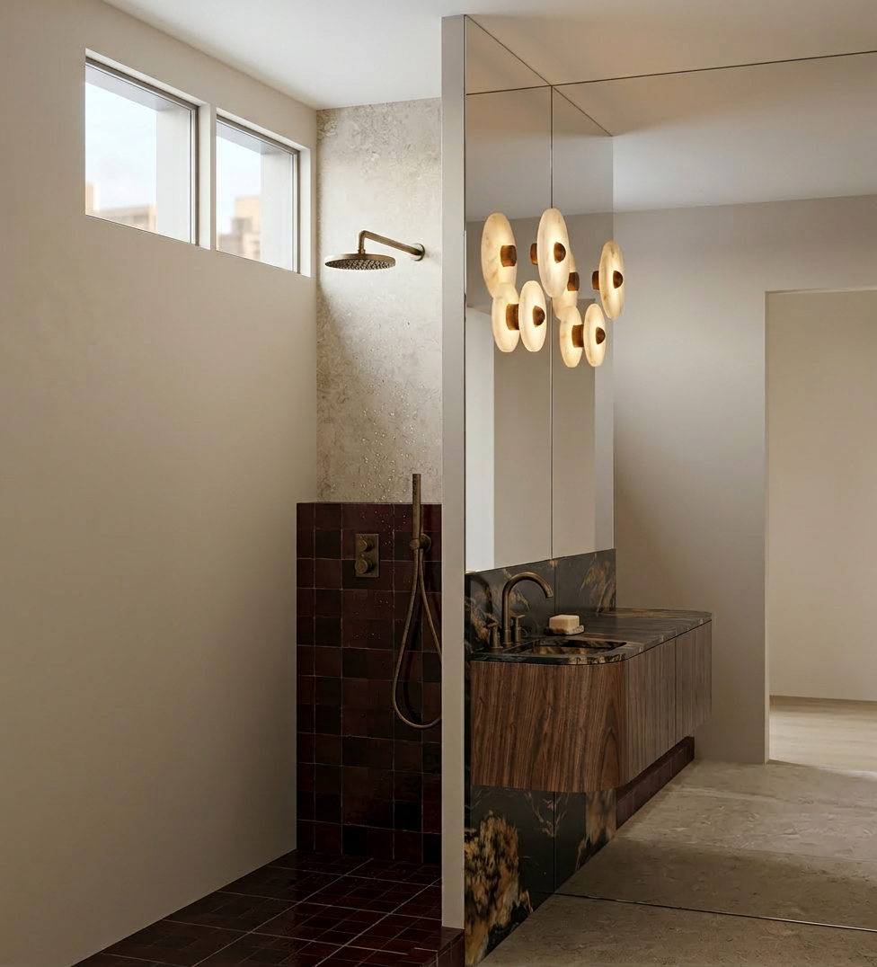 the walls in the shower are covered with marazzi mystone tivoli beige tiles the wall lights are the median model from apparatus studio in alabaster the dark stone is black fusion quartzite the fixtures are in bronze the small square tiles are zelige in dark bordeaux tiles like this https www terredezellige com produit mosaique terre de zellige 3x3 cm sur plaque de 30 5x30 5 cm 07 marron fonce the wall on which is affixed the vanity and the wall lights is fully in mirror there are no fixtures on the wall beneath the window the bathroom is on the 6th floor the floor under the vanity is in the marazzi mystone tivoli beige tiles the walls other than the wall is in the shower are in light beige there is only a small window on the top of the wall it is a small bathroom the wall with mirror is only behind the wall lights and the vanity