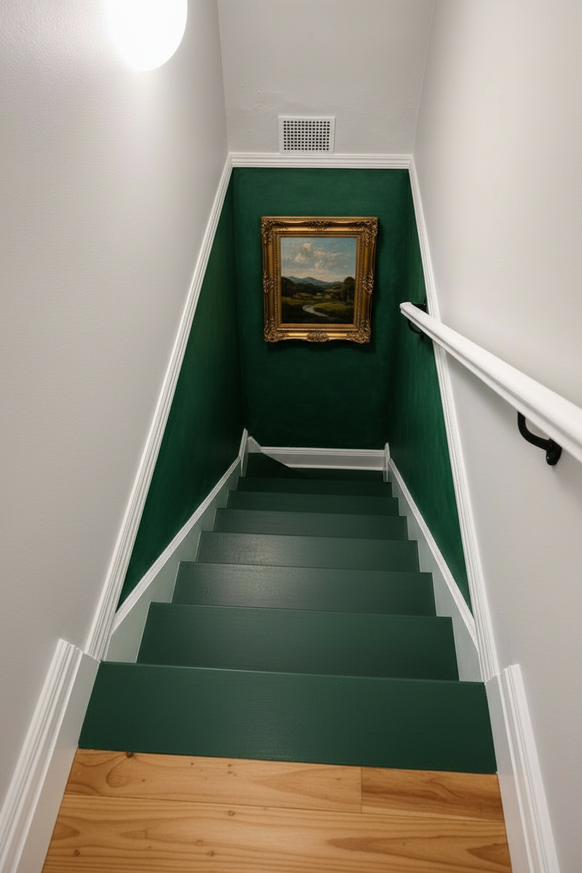 continue the pine floorboards down the stairs remove the white section of stairs stringer make the upper section of the walls more creamy like dulux beige royal