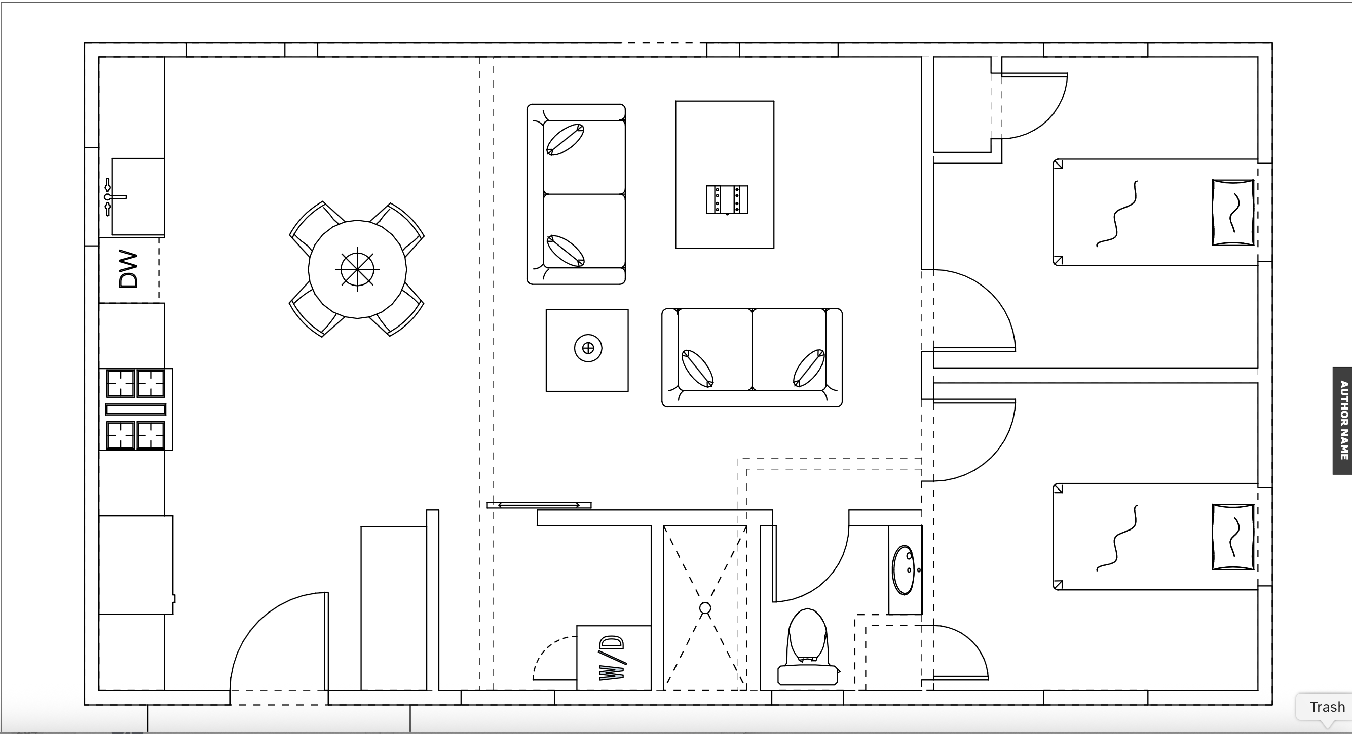 this is all interior home generate a rendering with a kitchen two bedrooms laundry room living room and bathroom give the bathroom a pattern floor and subway tile on the walls kitchen cabinets will be white and flloring will be a wood grain oak flooring wide plank