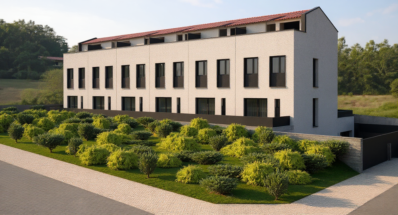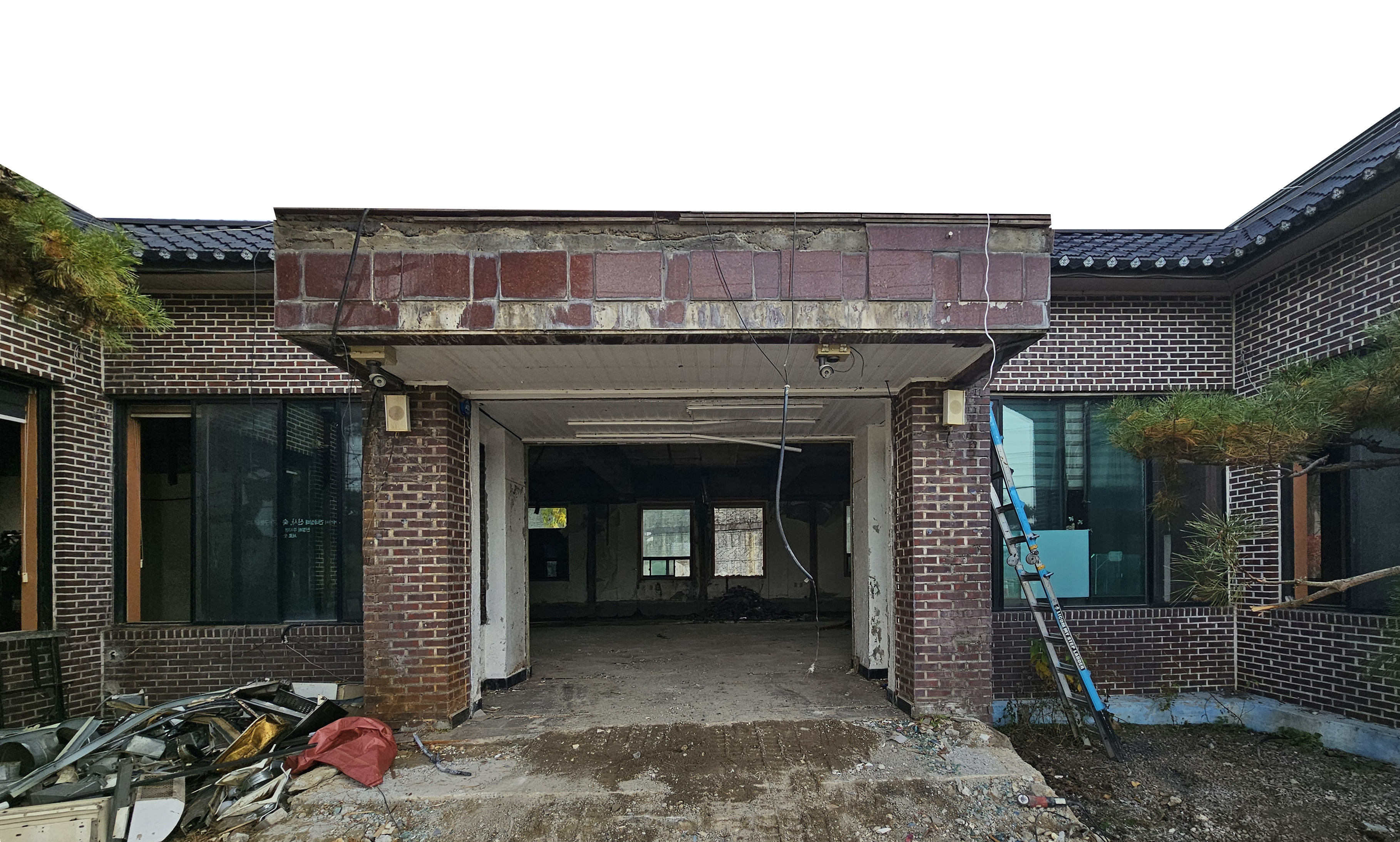 modern style cafe center entrance canopy is modern full wall finish white brick plywood finish on the wall in the middle frame black center facade canopy concrete place cafe bar counters deep inside remove the arch removal of the roof the front garden has grass and center stepping stones remove the arch removal of the roof tiled roof removed place pine trees on both sides of the outside the window is a fixed window