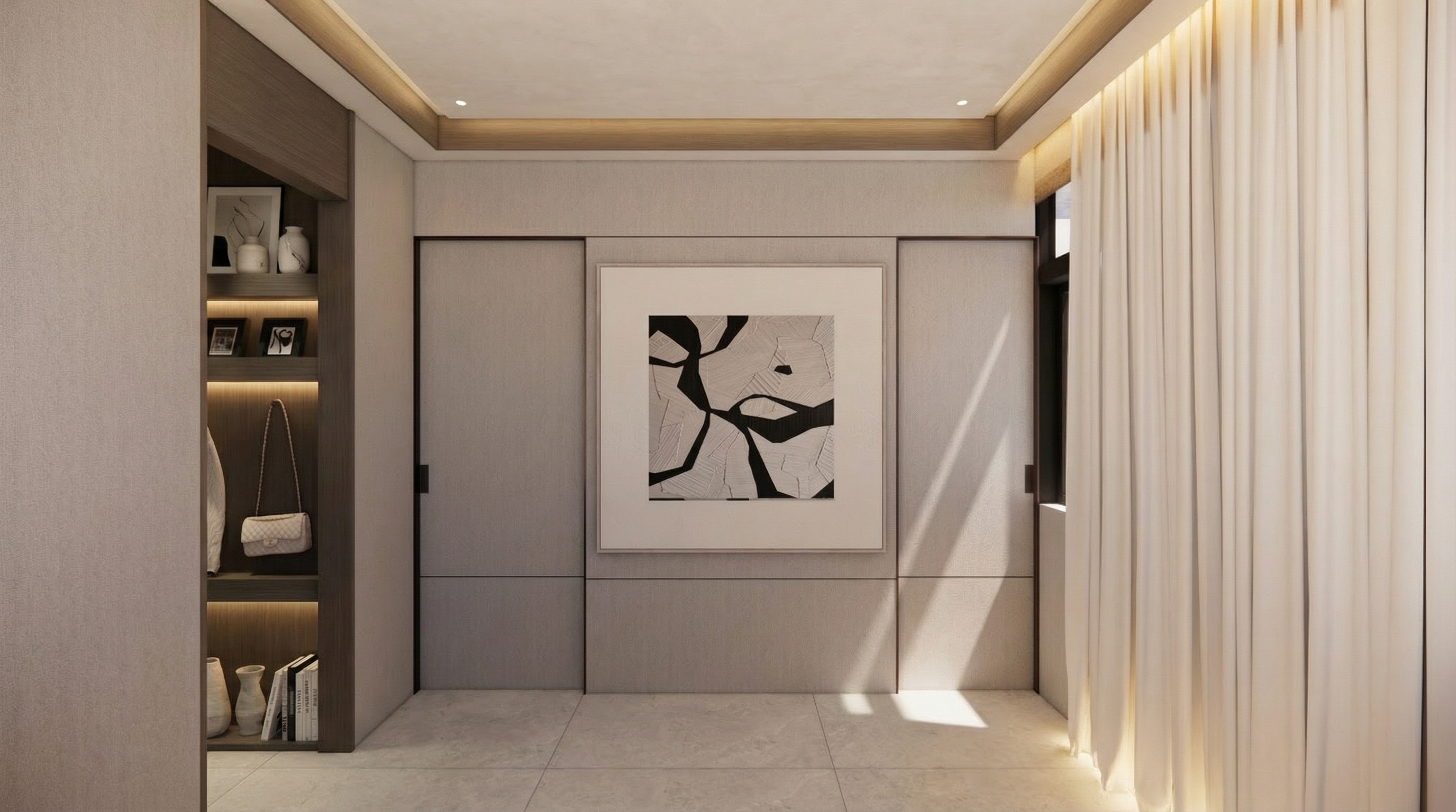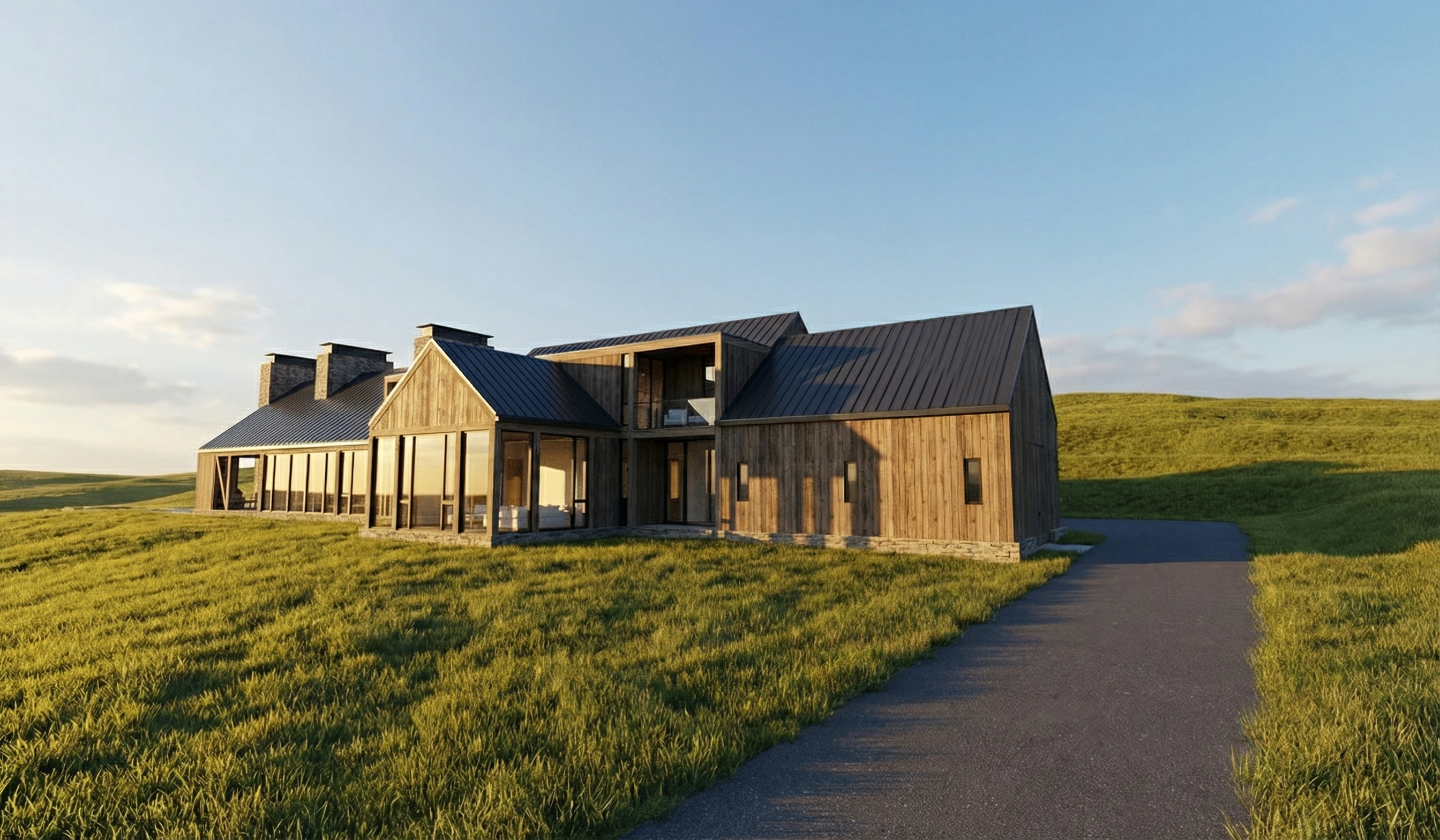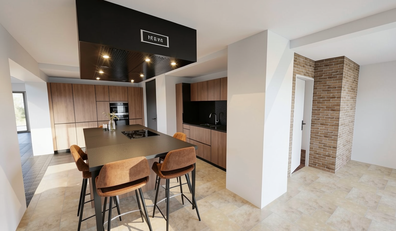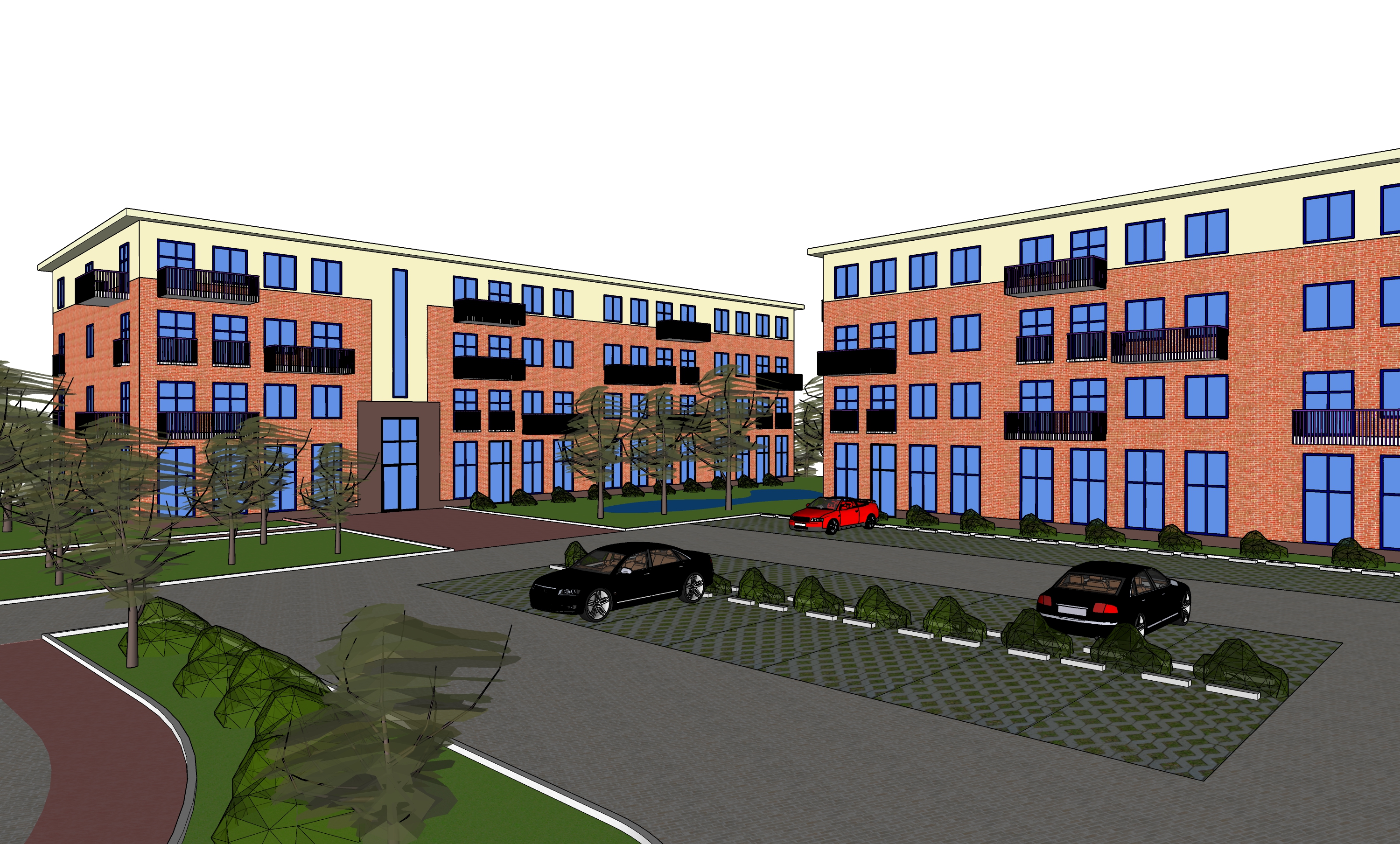 transform the uploaded image into a realistic scene absolutely preserve the building forms layout and camera angle exactly as shown in the uploaded image without any deformation set the atmosphere to a clear midday scene with a few clouds in the sky apply highly photorealistic landscaping adjust the roadway color to be brighter than in the uploaded image while keeping the sidewalk color consistent with the original image design both the roadway and the sidewalk to appear as block paved surfaces composed of neatly assembled paving units do not alter any other elements