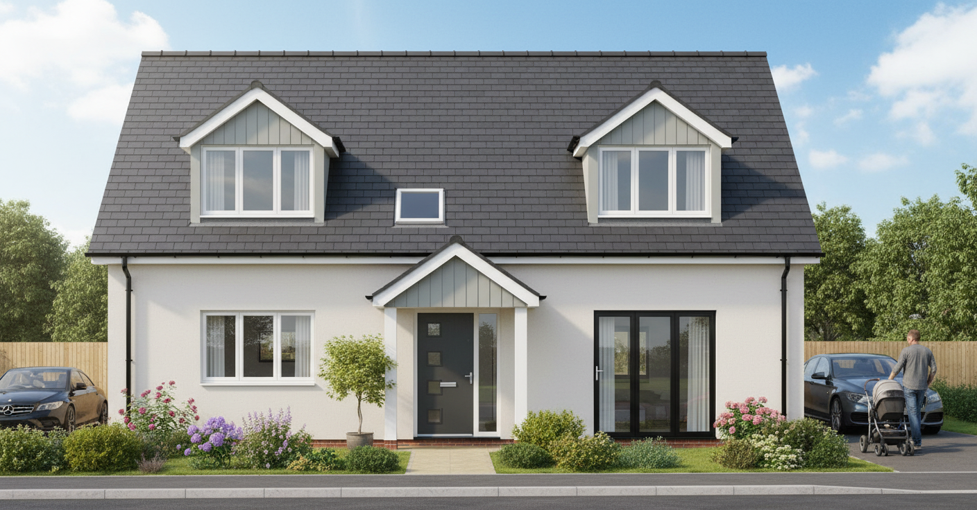 render a serene tropical setting featuring two charming huts with thatched roofs the left hut is a traditional design with white walls and a beautiful thatched roof in natural earthy beige tones beside it an a frame hut with similar thatching offers a modern twist both huts have glass doors reflecting the bright midday sun on the decks place two sun loungers in warm golden tones surround the scene with lush green grass on rolling hills under a brilliant blue sky dotted with soft fluffy white clouds the atmosphere is peaceful and inviting evoking a sense of relaxation and natural beauty