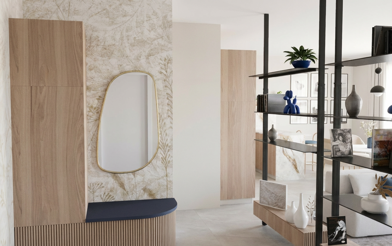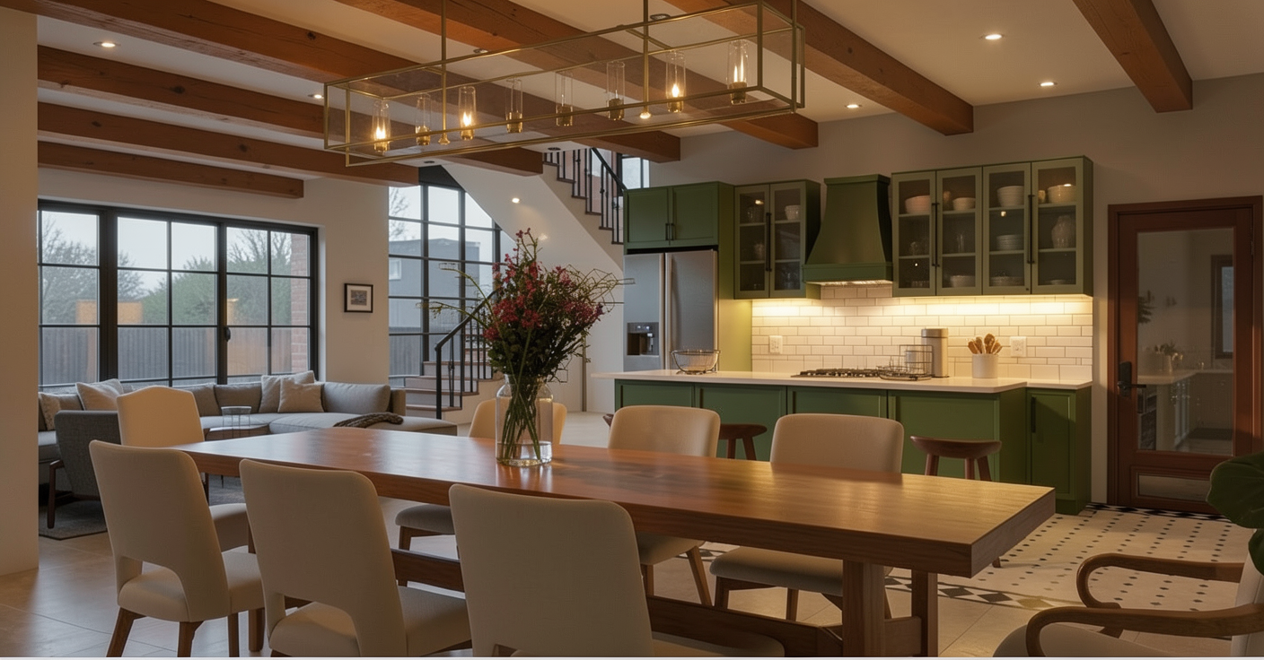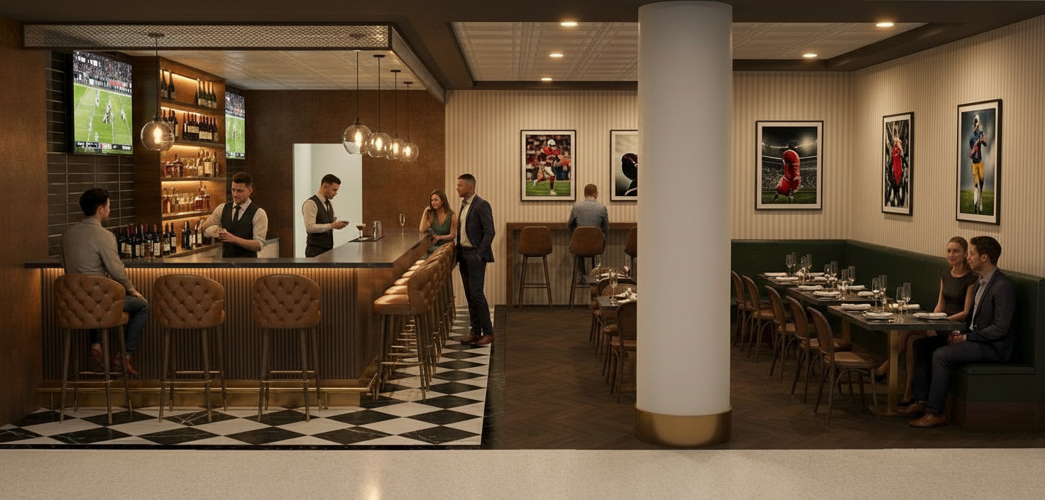 add an additional glass pendant light to the bar evenly spaced from the pendant light shown on the far left side of the image keep the rest of the ceiling and lighting configuration the same make the vertically striped walls a little darker in tone they are currently a little to bright for the space the banquet seating should be a darker emerald green leather however the material is currently shown too dark the high top on the back wall is a standing table only remove all 3 chairs currently shown at the back high top and have the person standing instead keep everything else about the image exactly the same do not adjust any other materials or layout not mentioned above